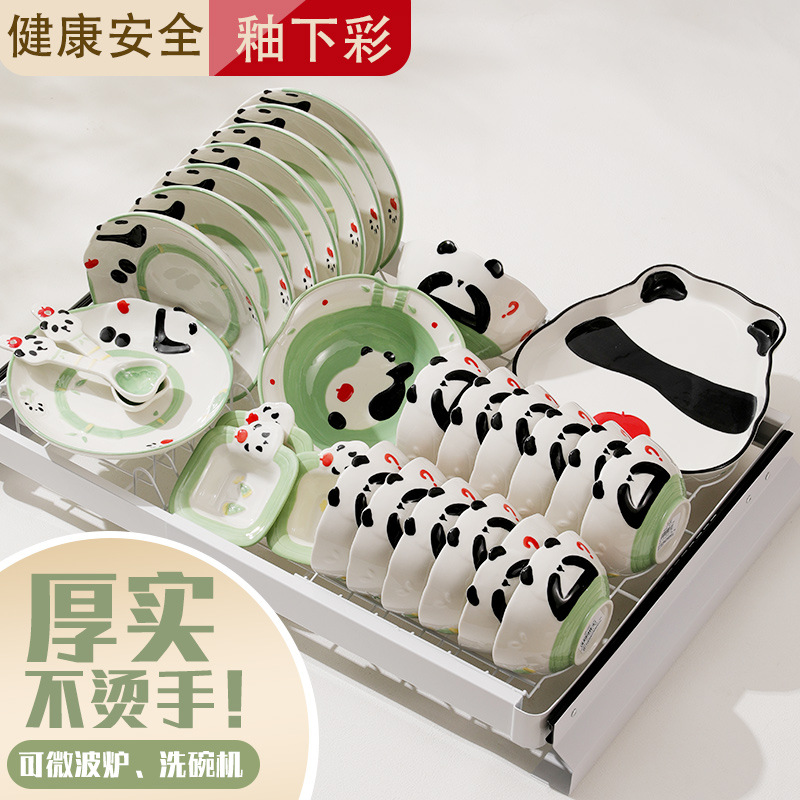 新国风可爱熊猫陶瓷碗碟手绘浮雕釉下彩创意家用饭碗汤碗菜盘鱼盘