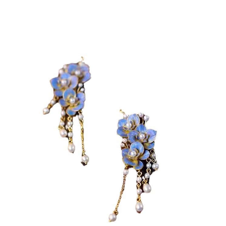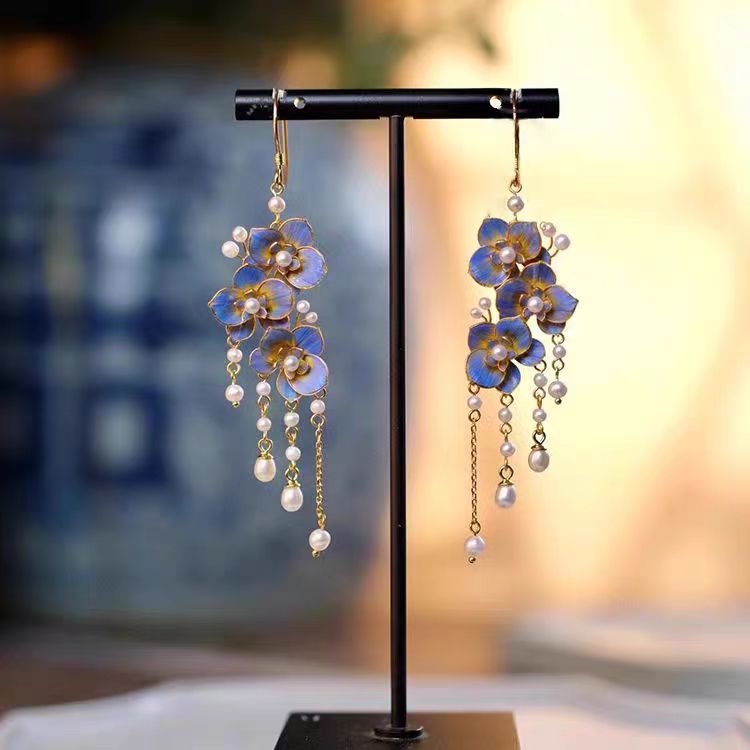 夏季新款花丝仿点翠烧蓝珍珠蝴蝶流苏耳环女复古古典风格耳饰女