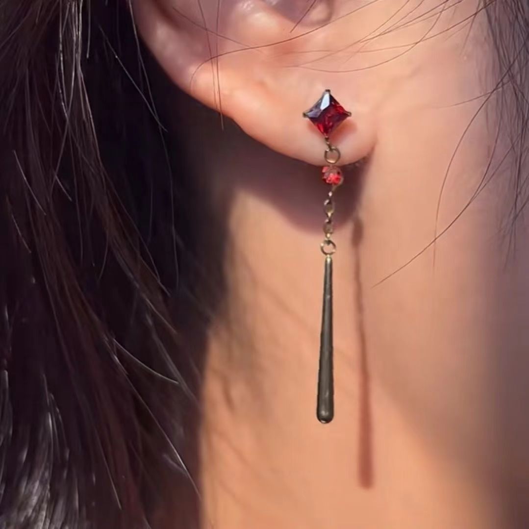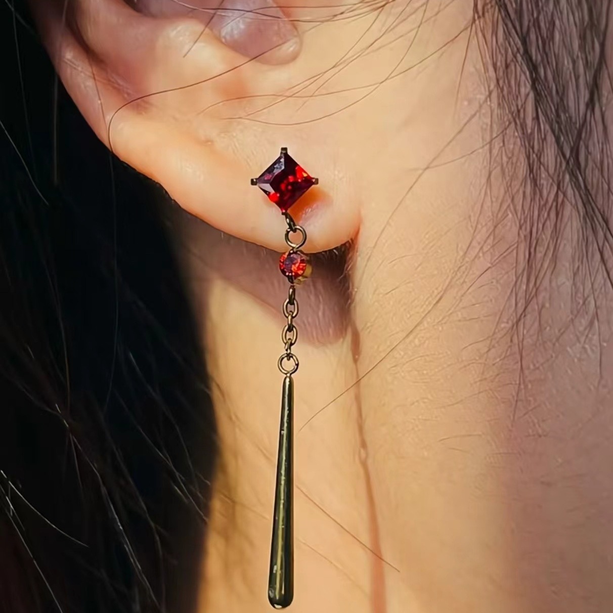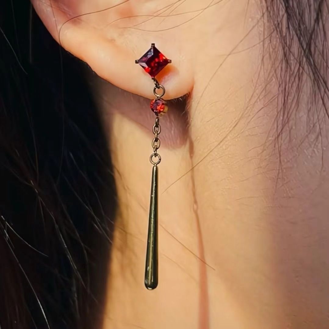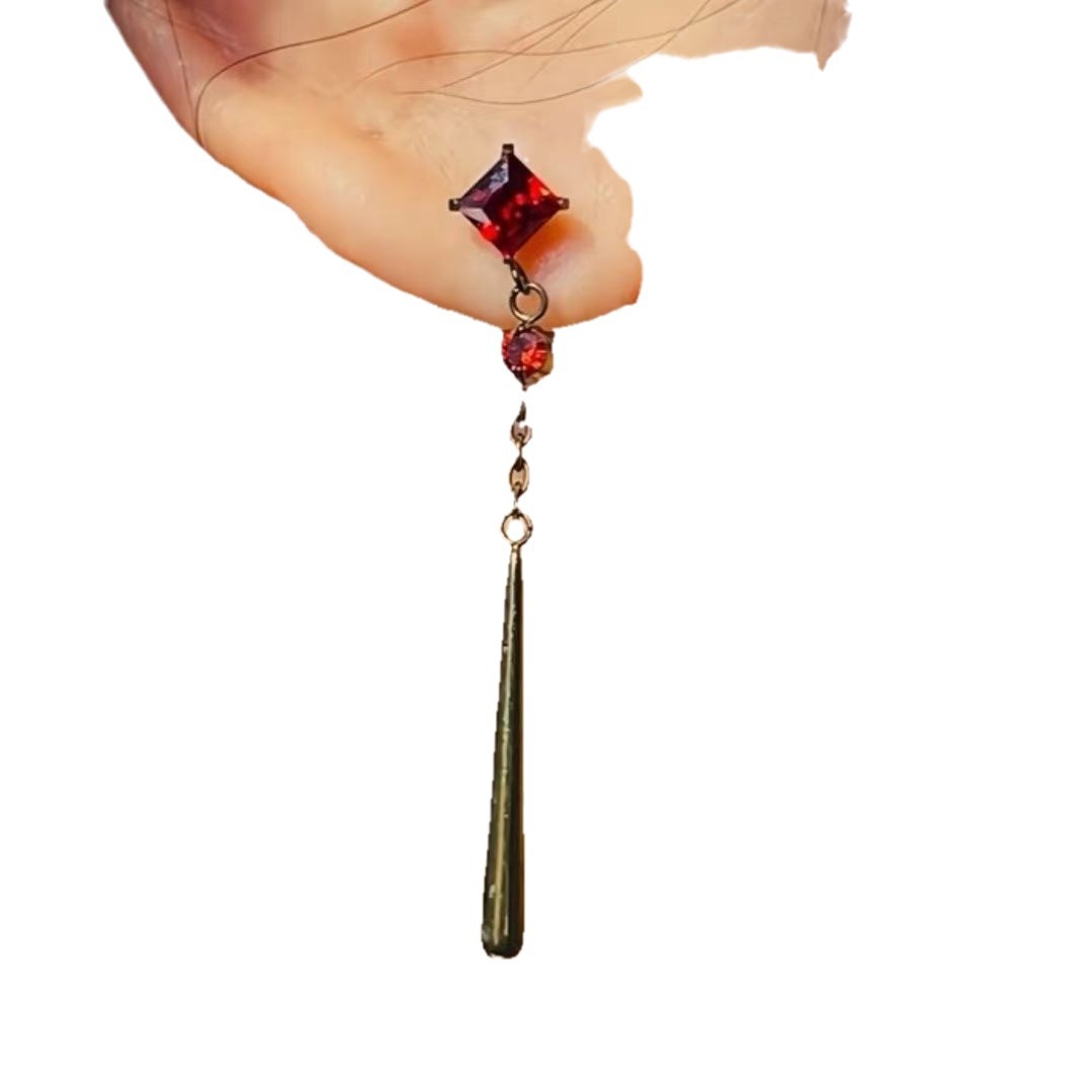 红色方糖水滴流苏吊坠耳钉轻奢高级感气质复古甜酷辣妹风长款耳饰