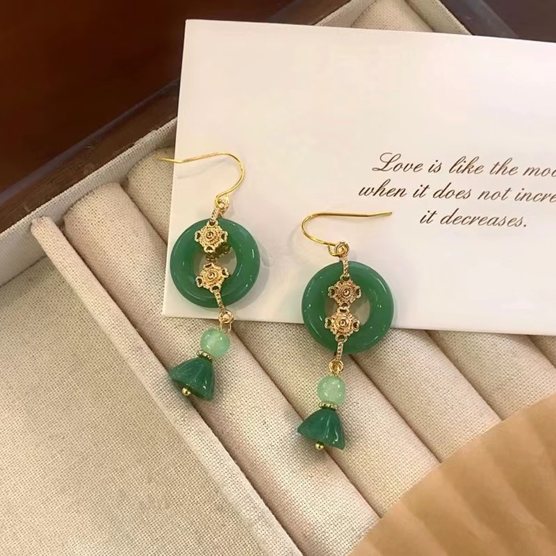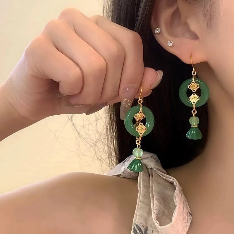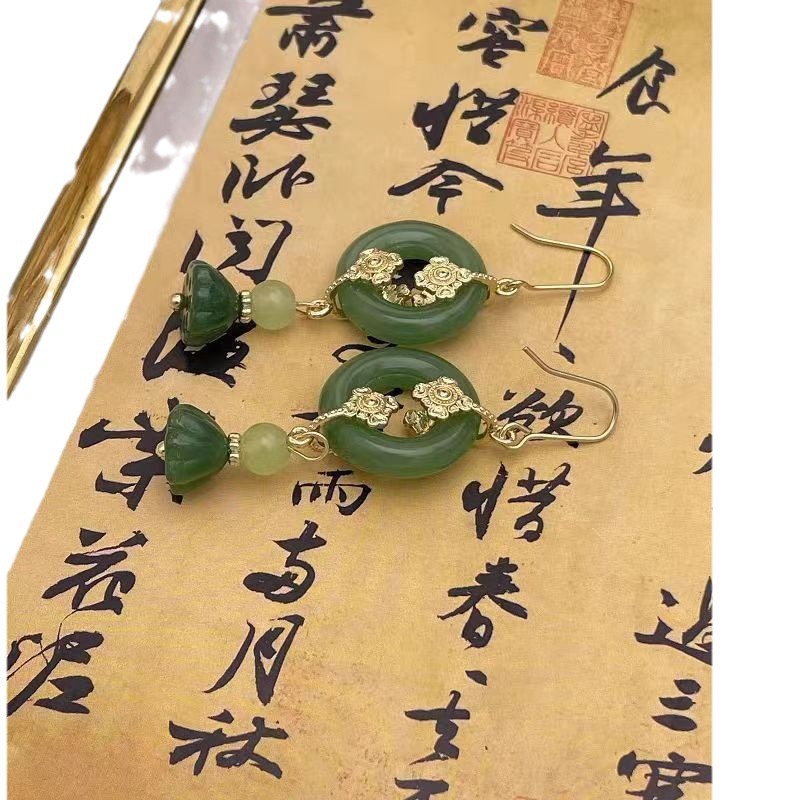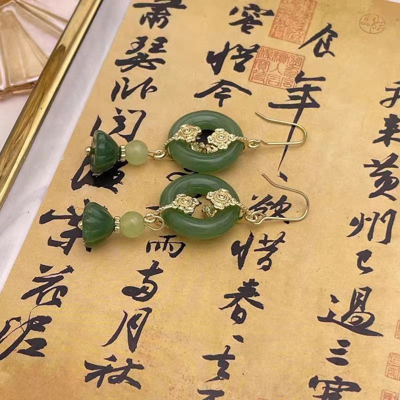 新中式绿色莲花圆环吊坠耳环国风简约耳钩扇形流苏耳环长款耳饰