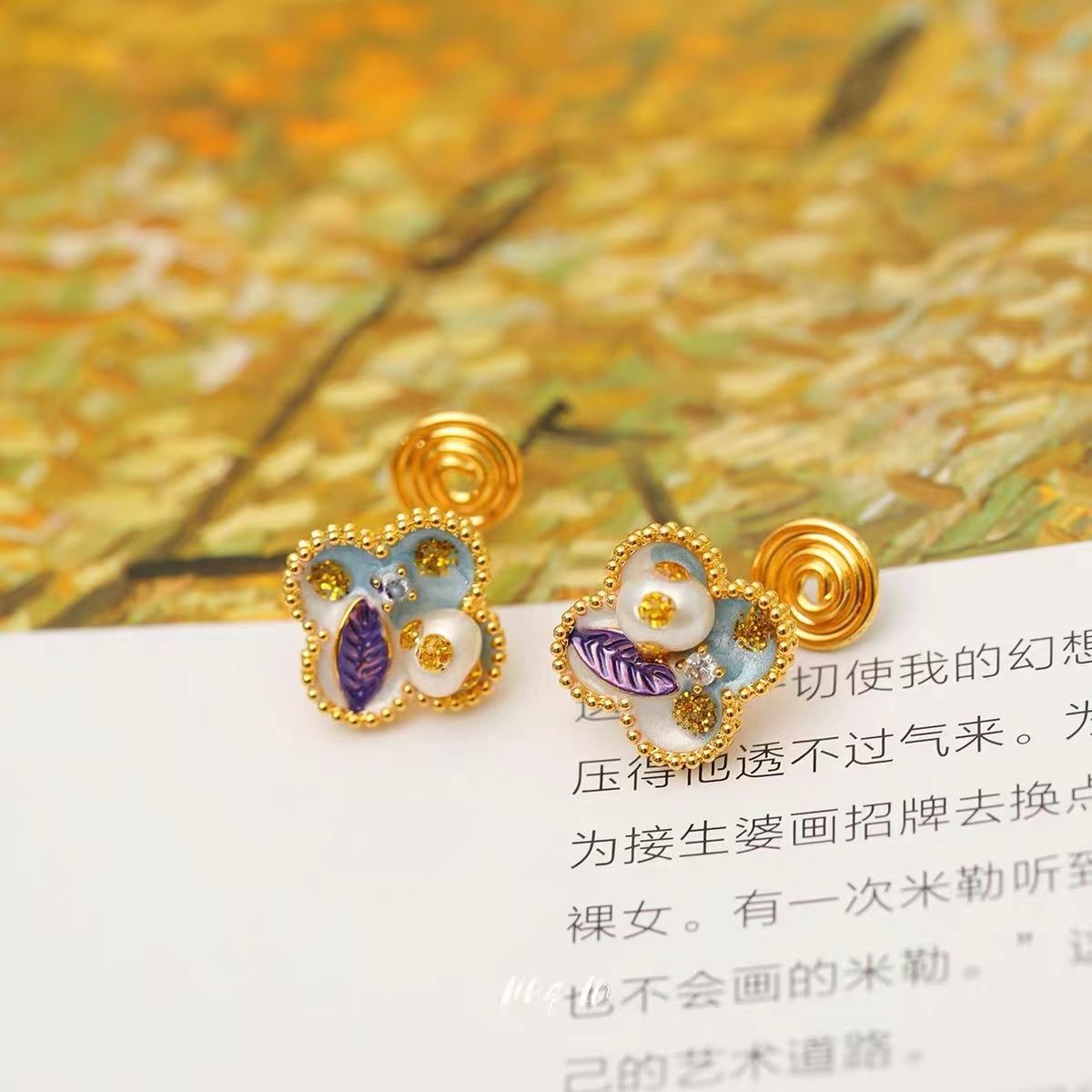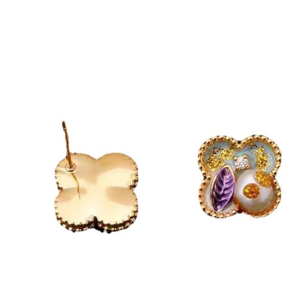 新款油画风四叶花朵珐琅彩绘耳钉女耳环高级中古风