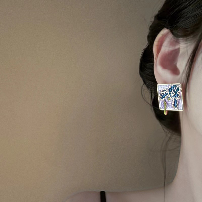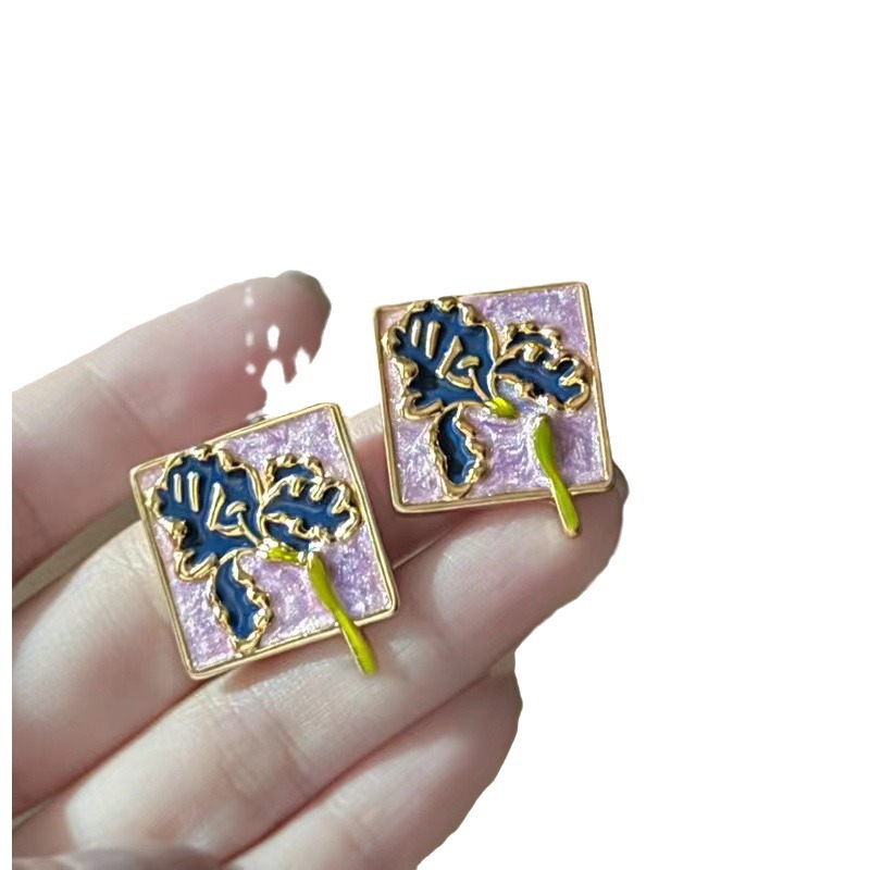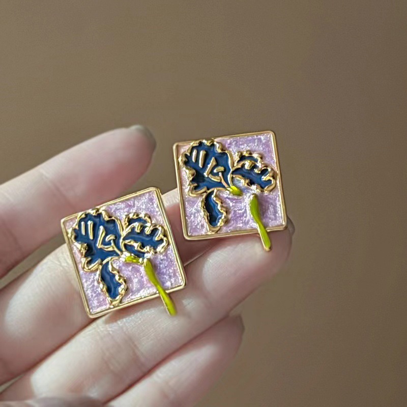 银针不规则滴油花朵耳钉方形清新甜美气质耳环复古百搭耳饰女