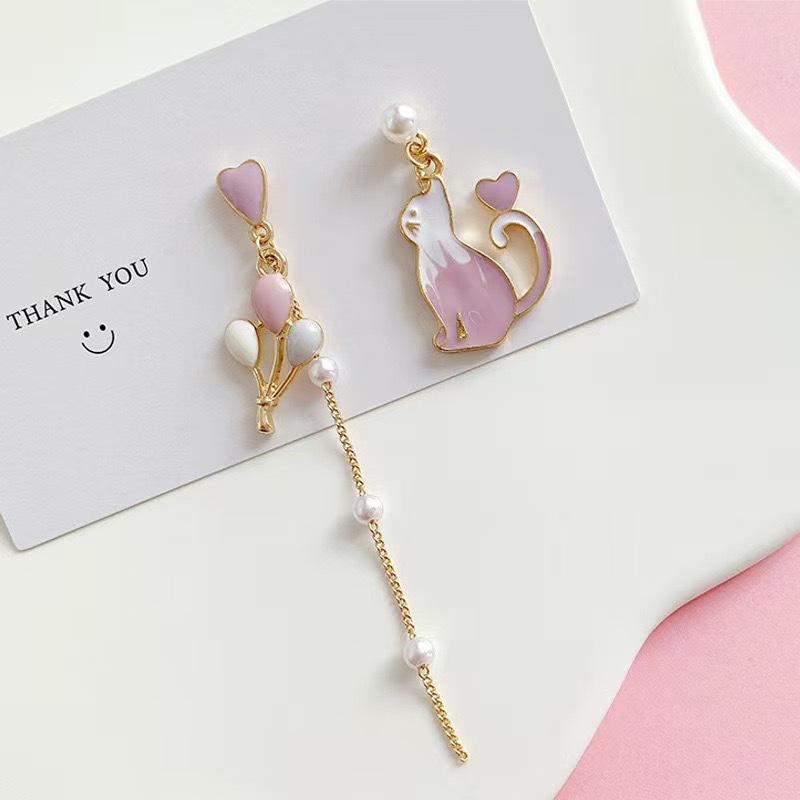 韩版925银针可爱猫咪不对称气球耳坠爱心滴油耳钉珍珠流苏耳环女