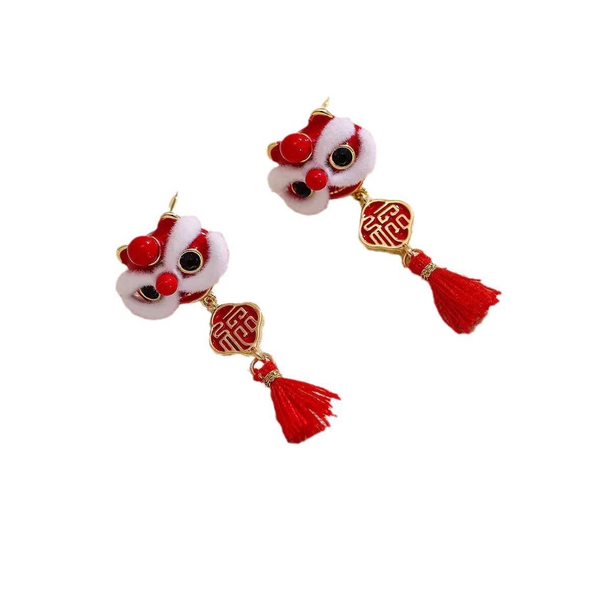 福字流苏丝绒醒狮耳钉新中式国风耳坠长款流苏过年喜庆耳饰女