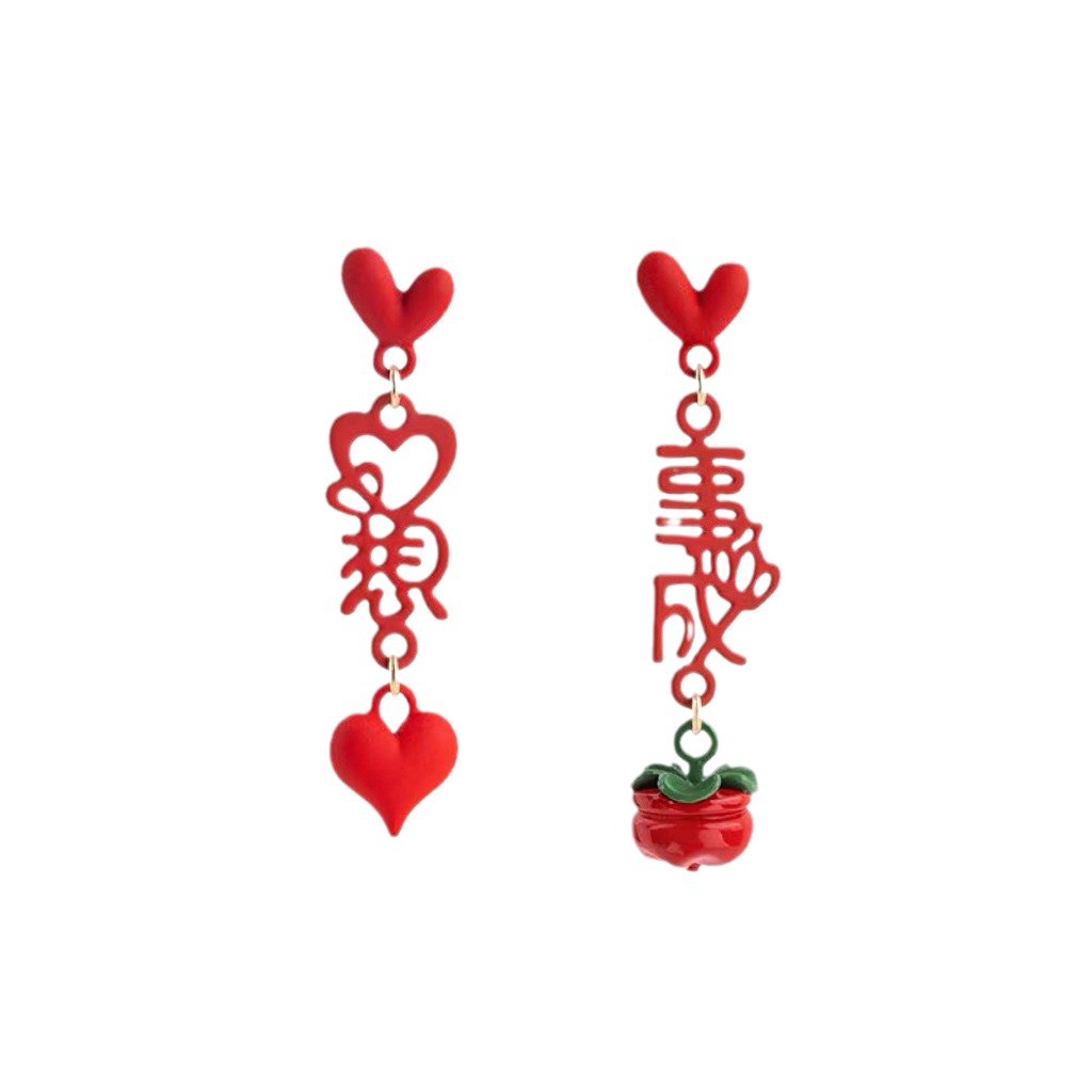 新年喜庆心想事成耳环红色爱心柿子耳钉过年耳饰少女