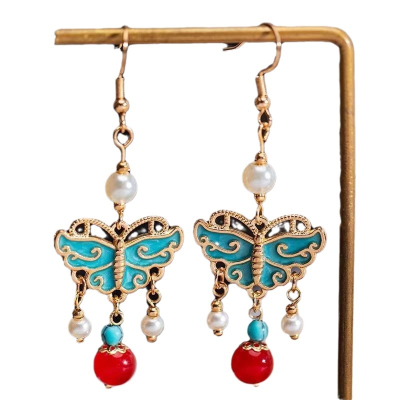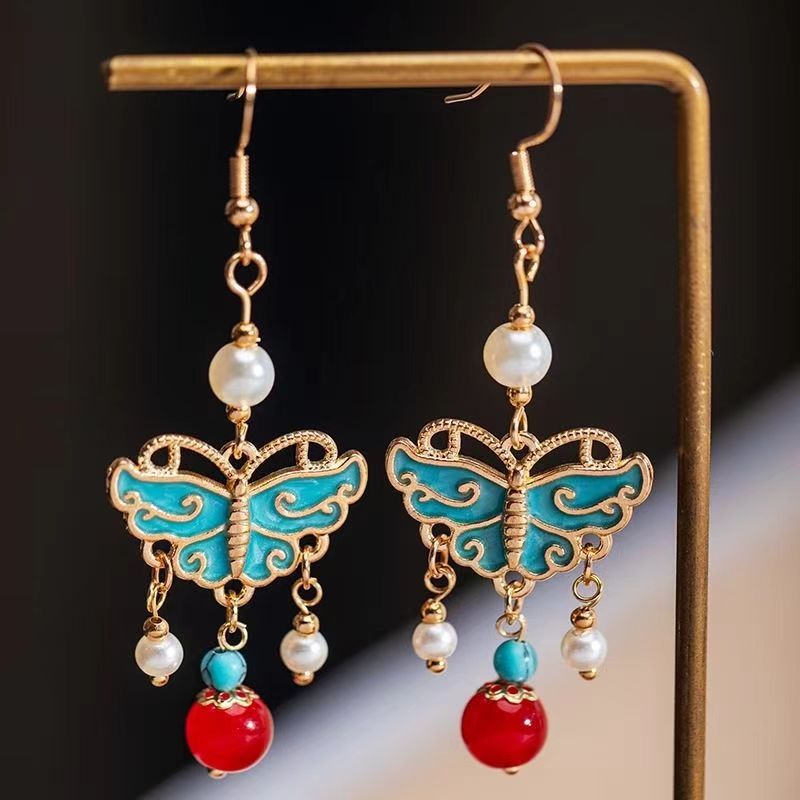 中式蝴蝶烧耳钩小众耳夹流苏国风耳坠精致汉服配饰耳环宫廷风