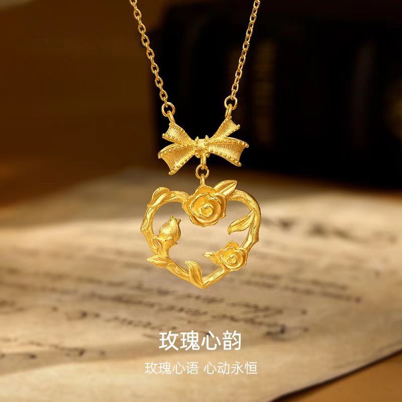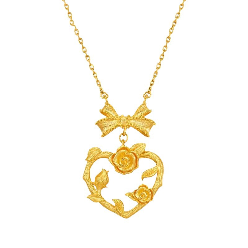 在逃公主玫瑰心韵黄金色项链磨砂玫瑰花吊坠蝴蝶结锁骨链首饰女