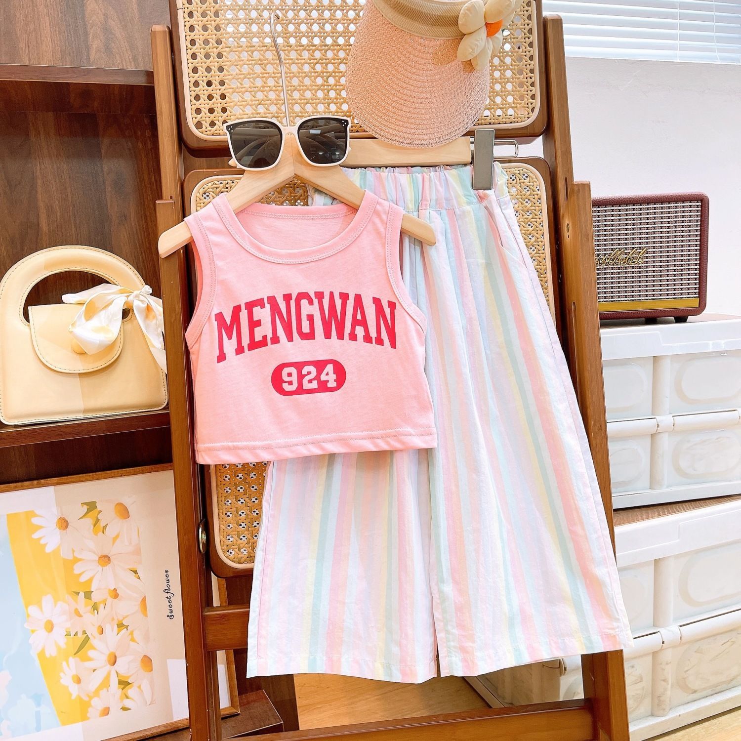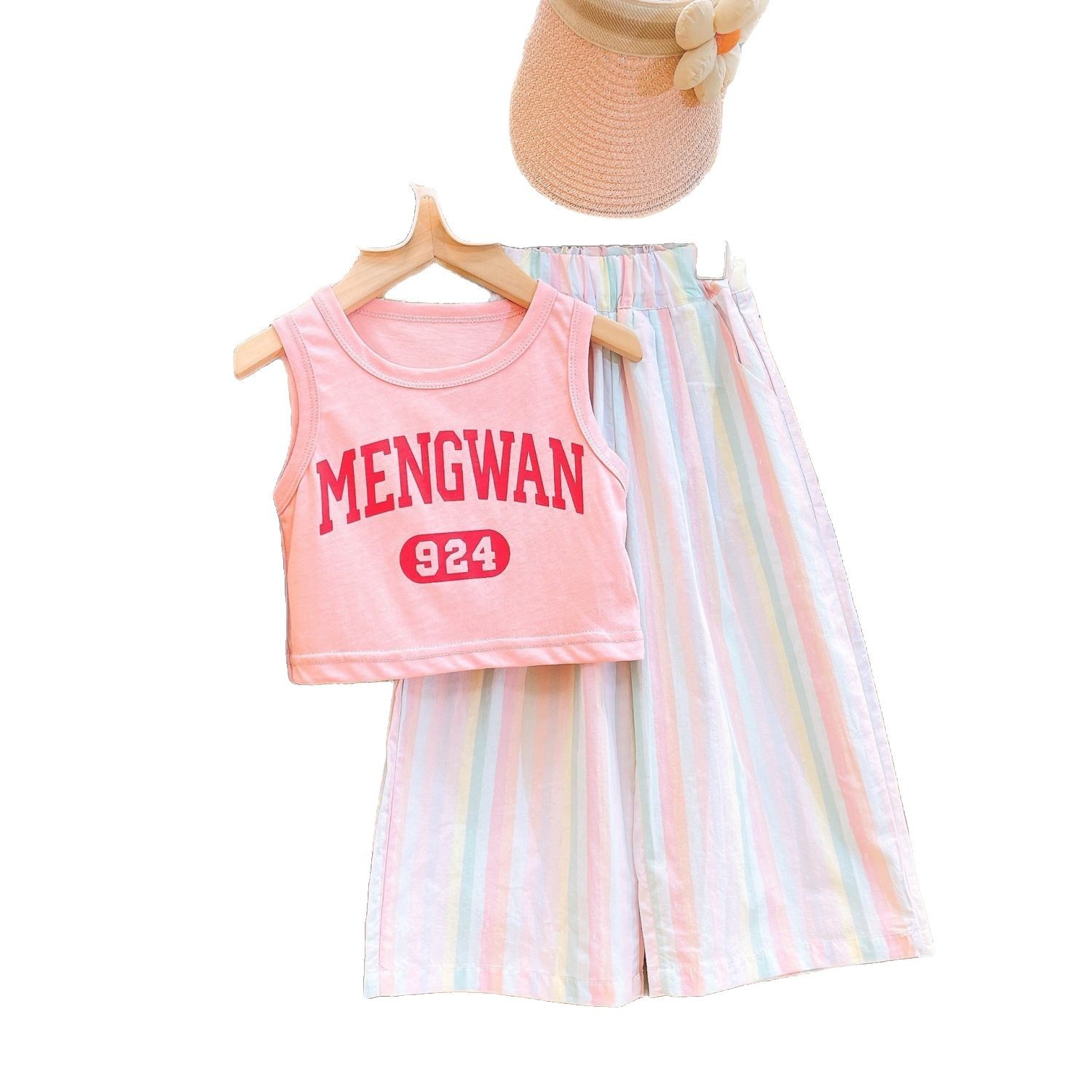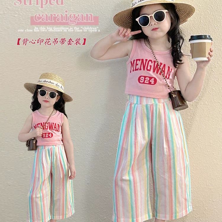 女童夏季套装新款网红洋气背心露脐装儿童条纹阔腿裤薄女孩两件套