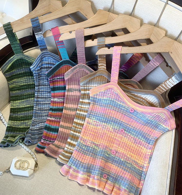木耳边小吊带背心女外穿彩虹条纹小众辣妹短款修身T恤无袖抹胸衣