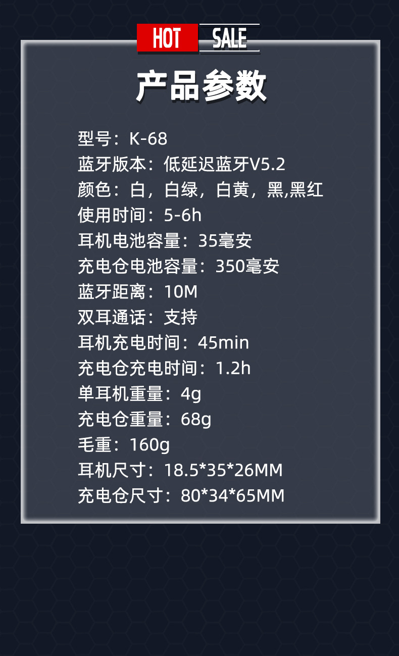 K68蓝牙耳机 入耳式电竞潮玩吃鸡手游戏TWS蓝牙耳机跨境新款私模