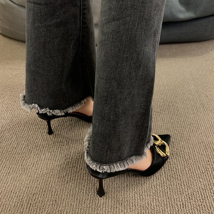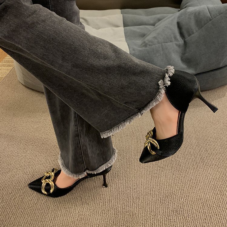 新款链条设计感尖头细跟法式小香风名媛裸色斩男高跟单鞋小众
