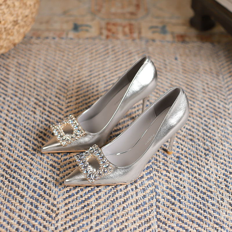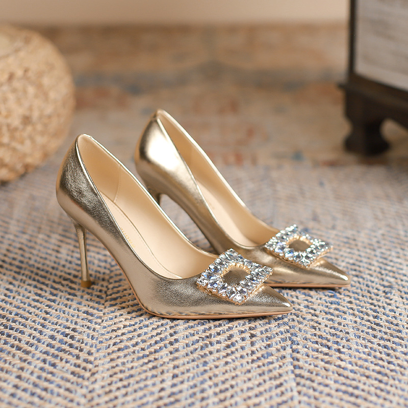 香槟色春季新款尖头细跟高跟鞋女水钻方扣仙女风名媛婚鞋单鞋