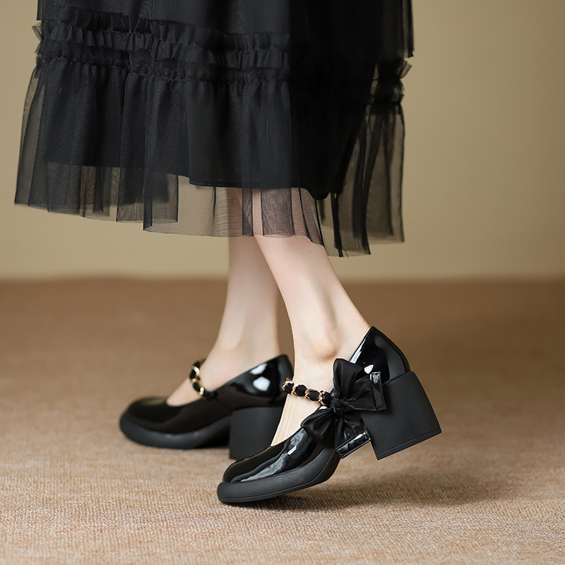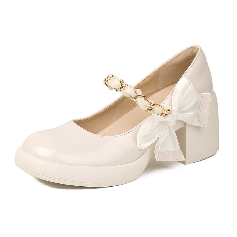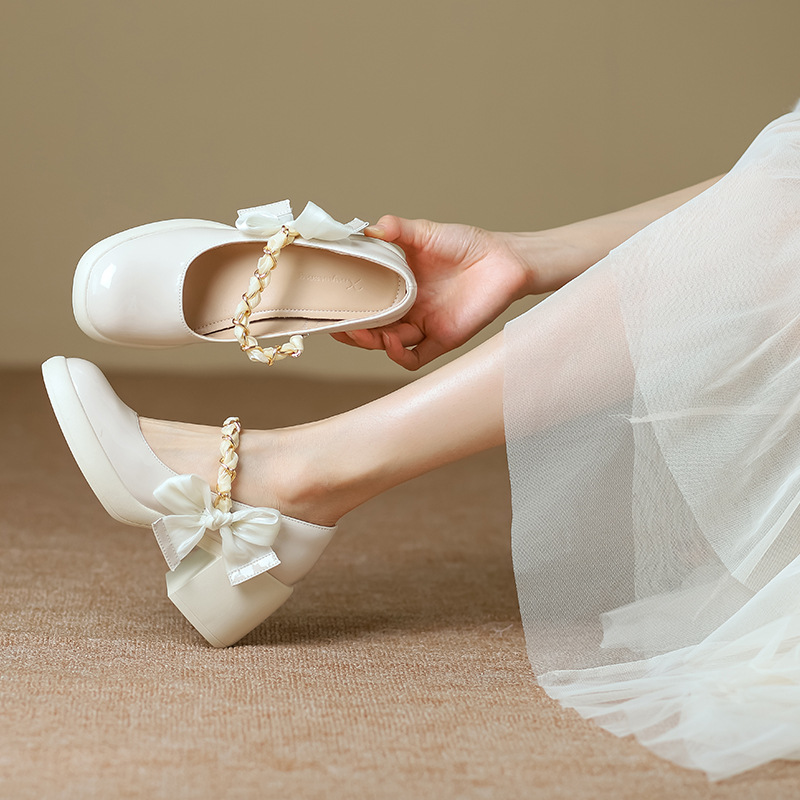 春秋新款厚底粗跟法式高跟鞋 白色玛丽珍鞋名媛风蝴蝶结单鞋388-7