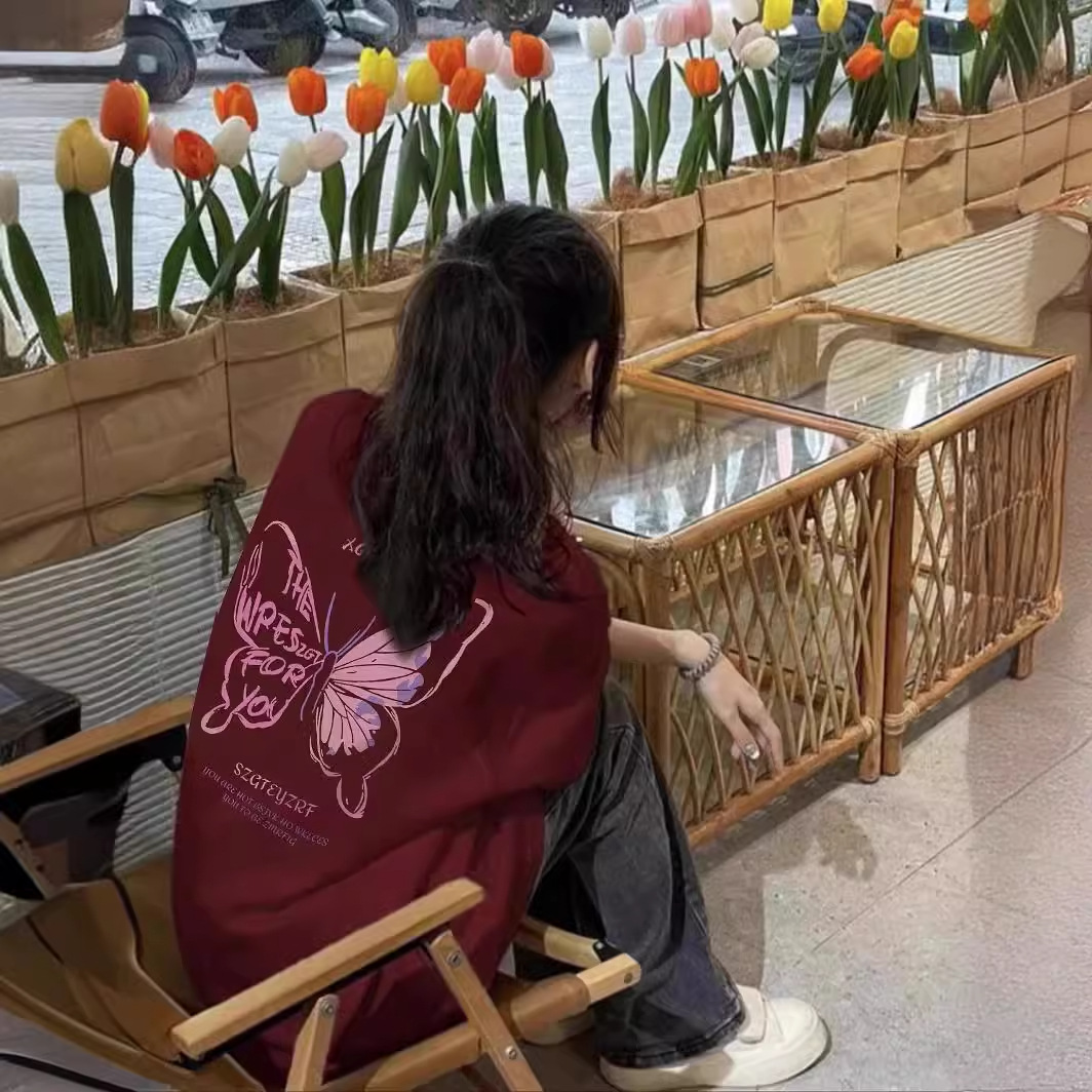 酒红色纯棉重磅短袖t恤女夏季美式复古设计感小众半袖宽松上衣潮