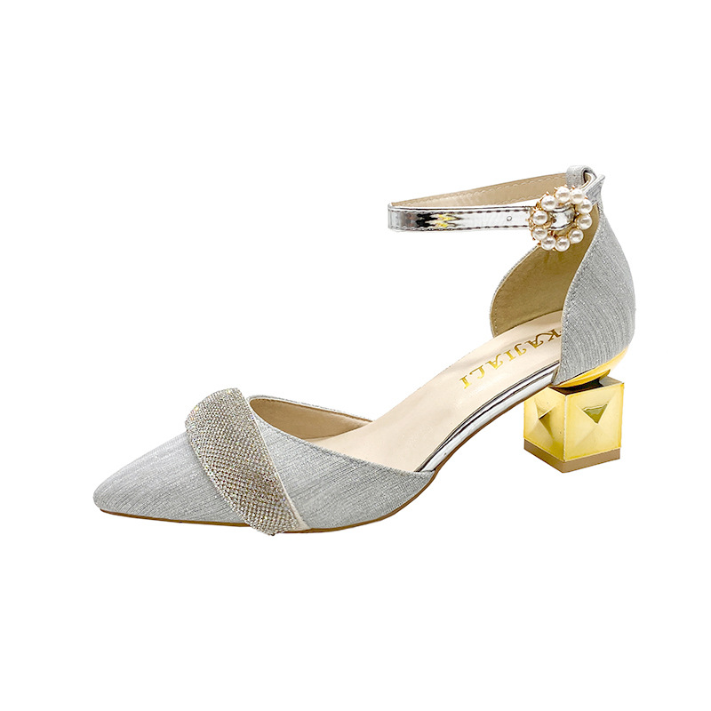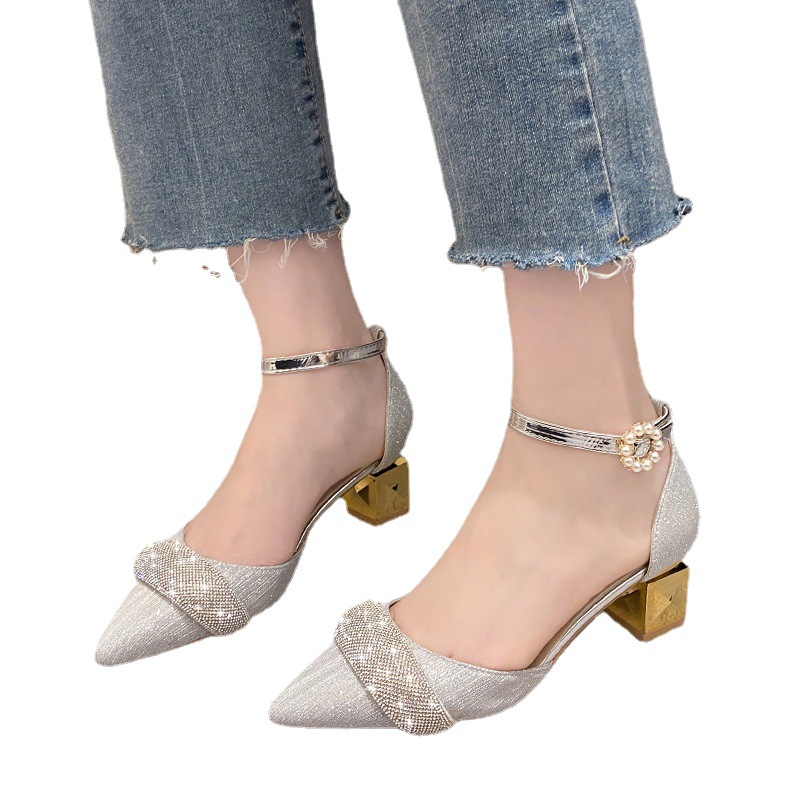 新款春季仙女风水钻尖头中空高跟鞋女粗跟凉鞋法式名媛中跟单鞋