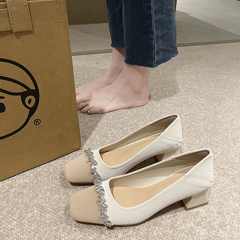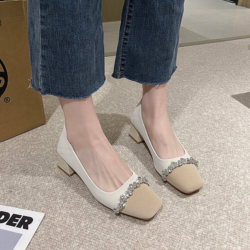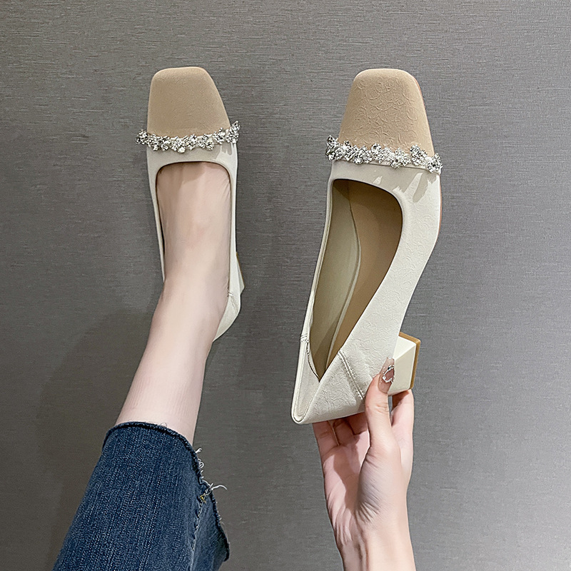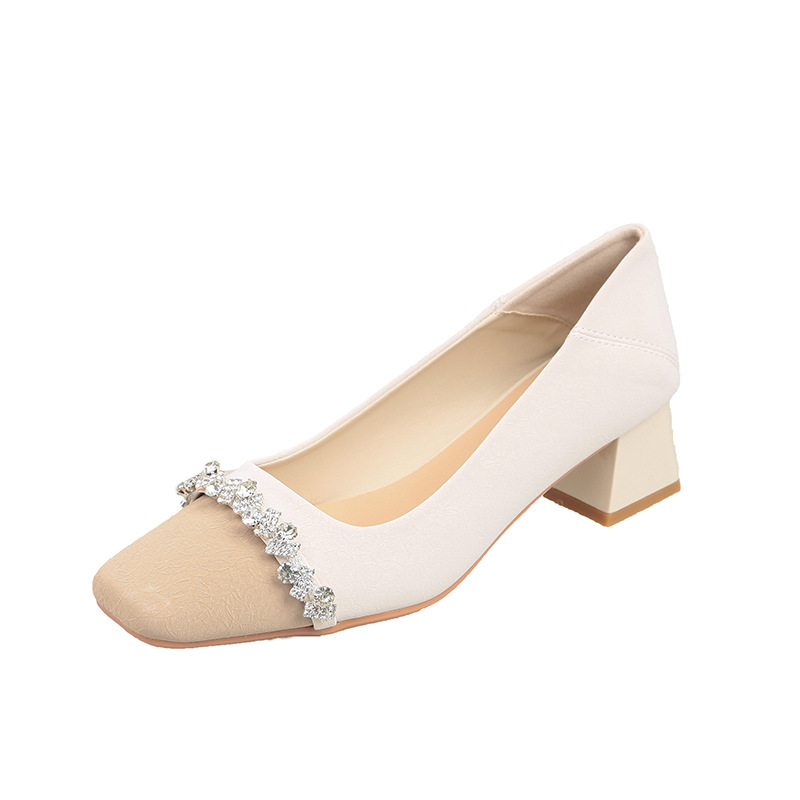 时尚百搭方头浅口水钻中跟单鞋女舒适方跟夏秋新款名媛风高跟鞋