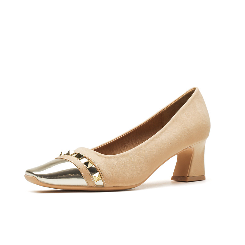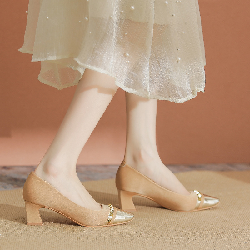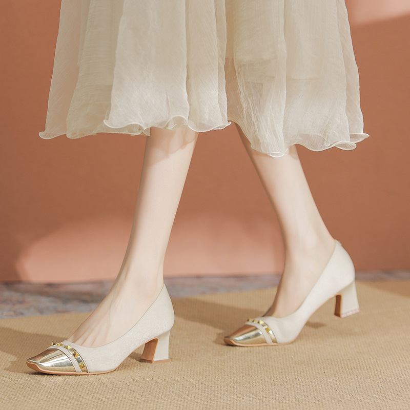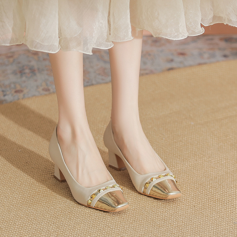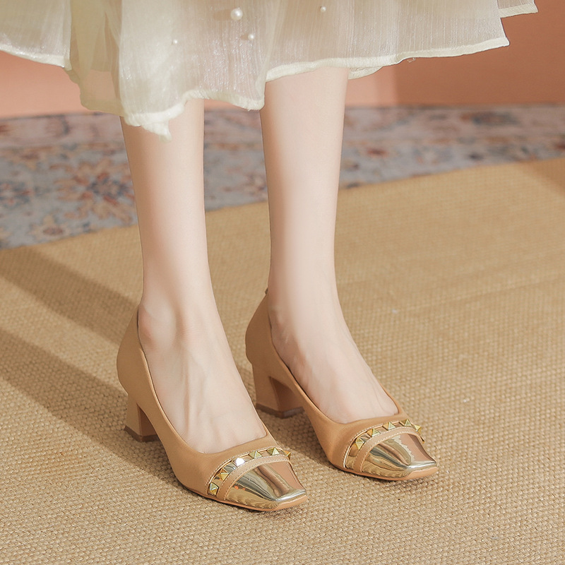 5115-1小香风拼色高跟鞋女新款春秋铆钉浅口方头粗跟单鞋名媛