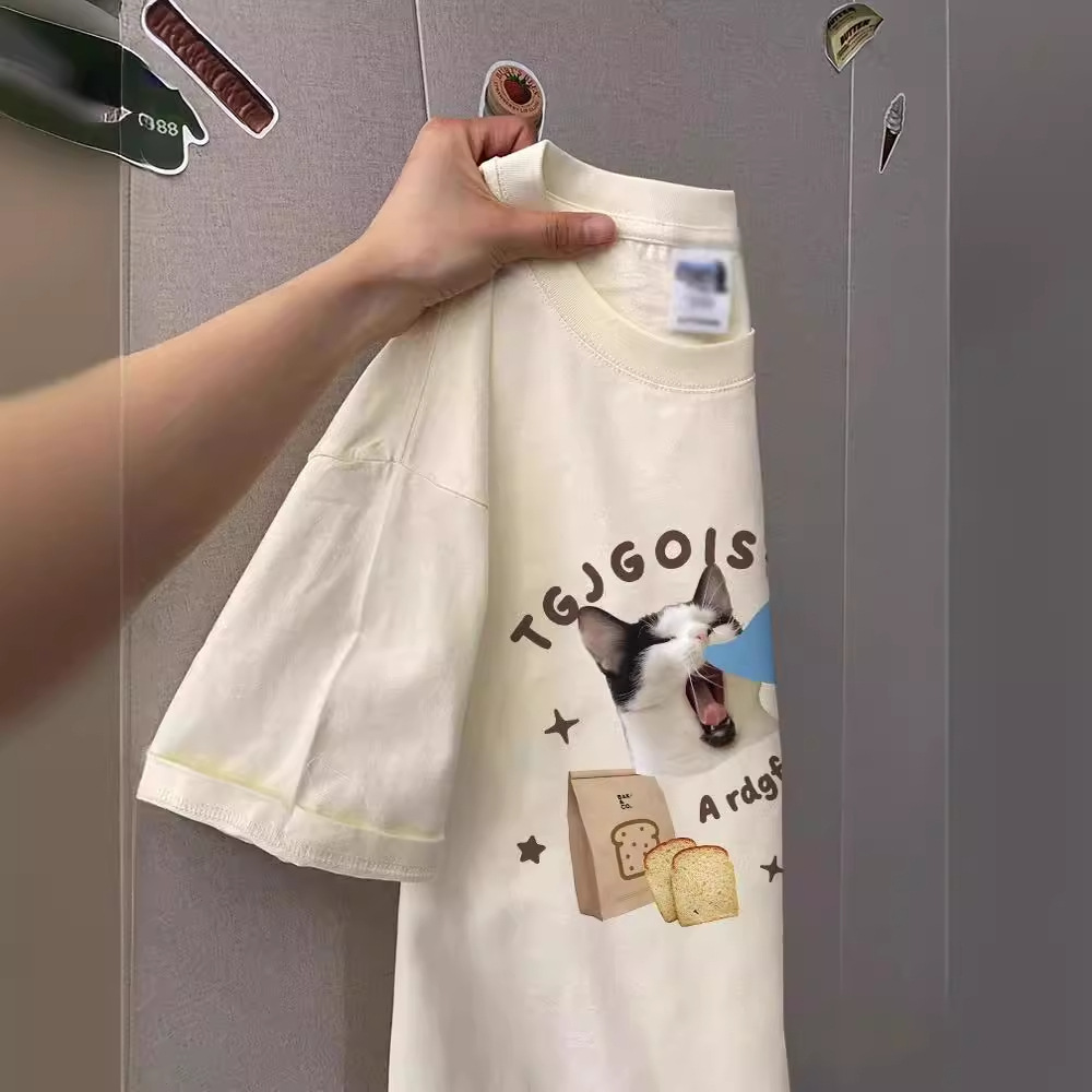 大码夏季纯棉正肩短袖t恤女宽松休闲瞌睡猫咪印花设计感情侣上衣
