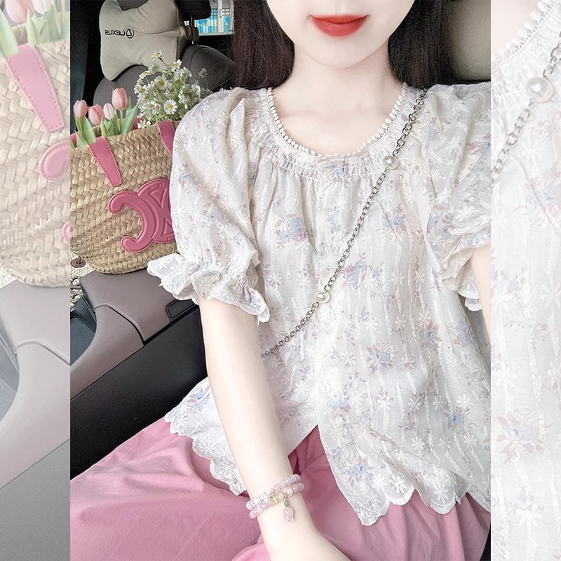 法式碎花雪纺短袖衬衫女夏季别致绝美小个子短款泡泡袖娃娃衫上衣