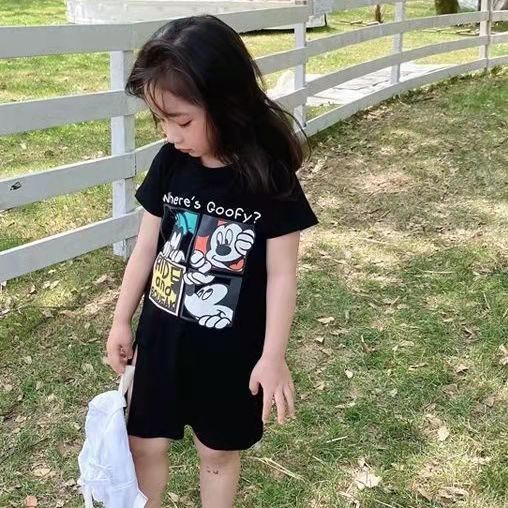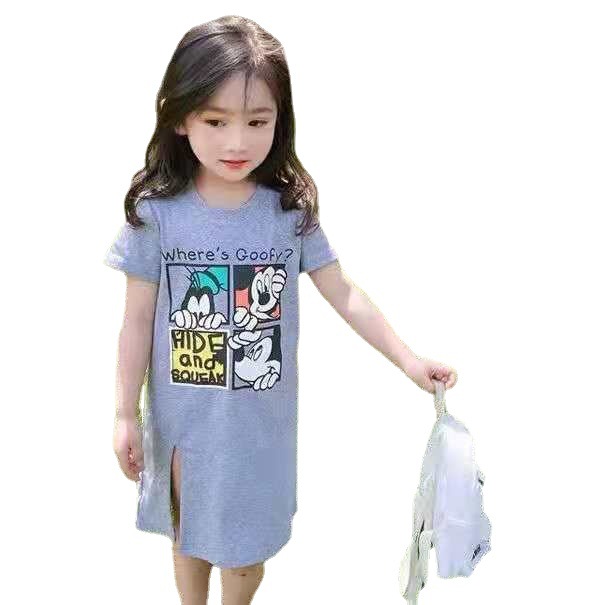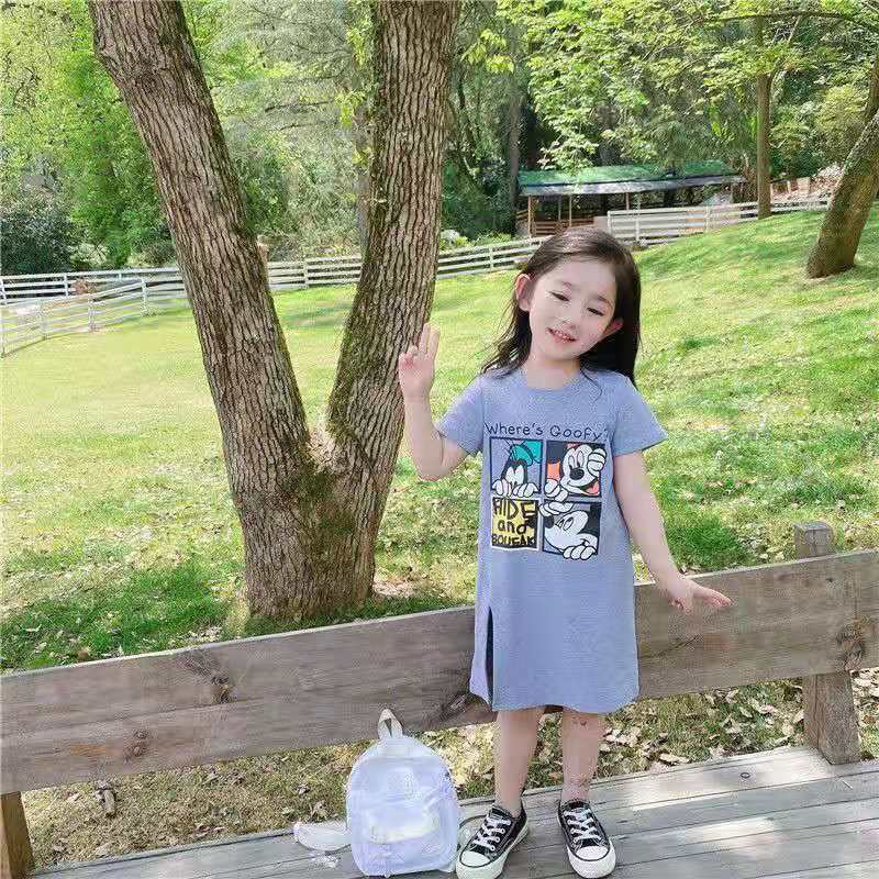 女童春夏新款卡通连衣裙女孩休闲中长款裙子宝宝开叉短袖长T恤裙