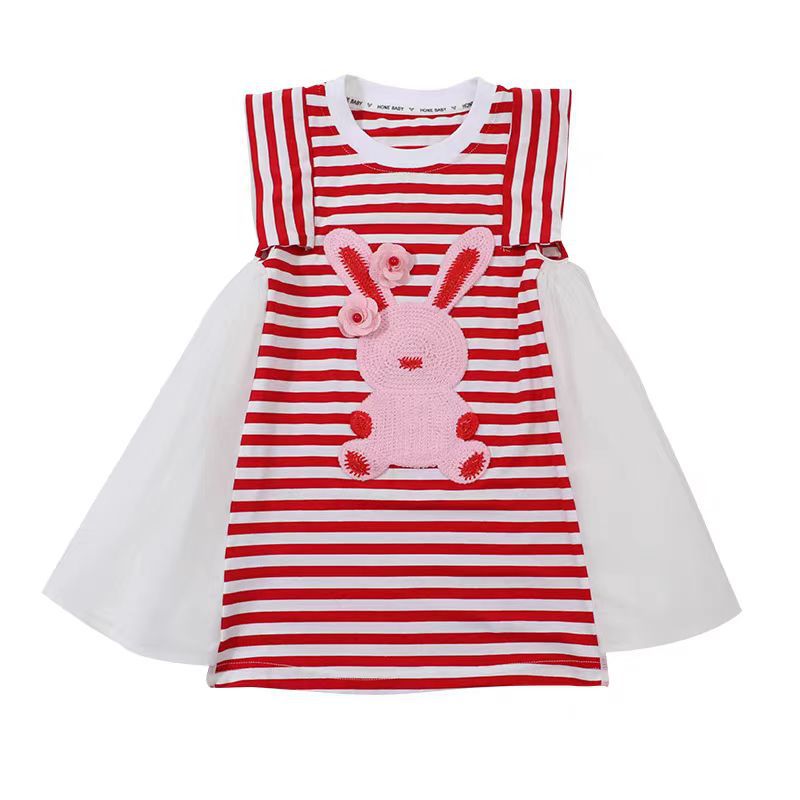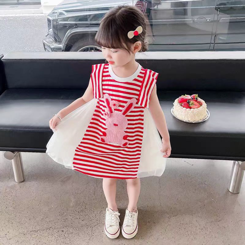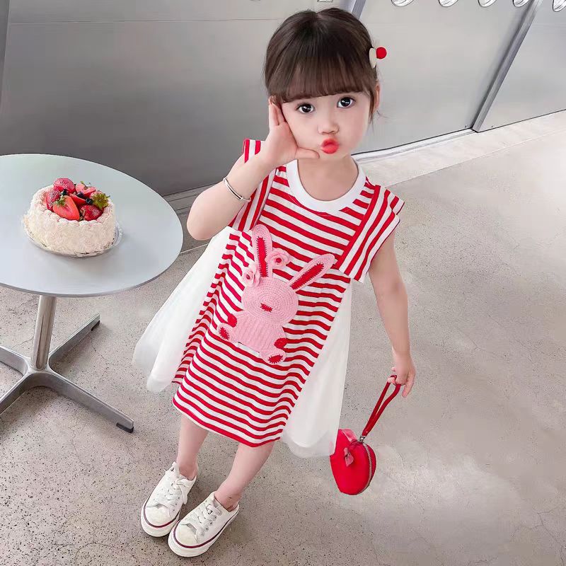女童卡通古风连衣裙中小童新款夏季洋气T恤韩版休闲中长款条纹爆