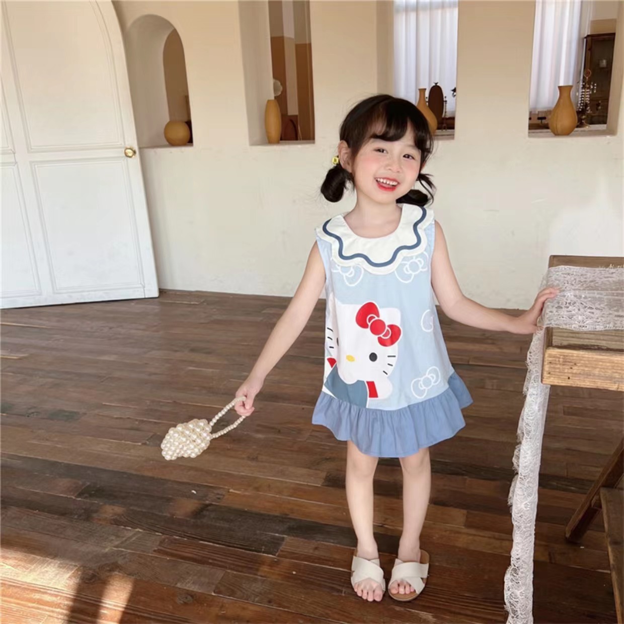 女童背心裙夏季新款甜美卡通连衣裙花瓣领无袖宝宝洋气公主裙