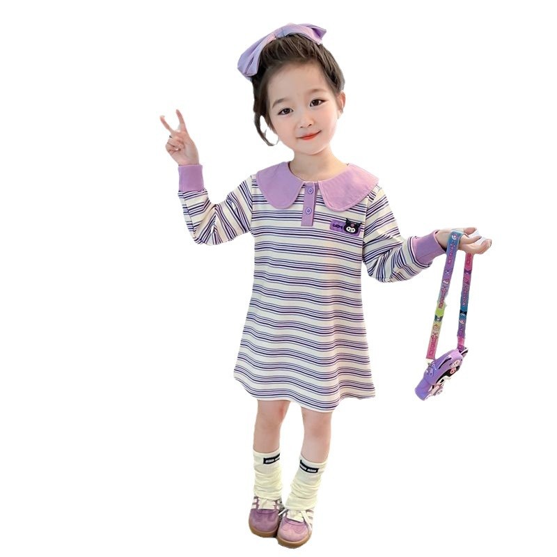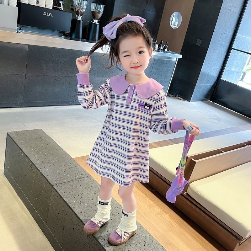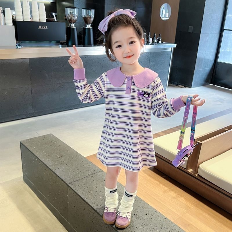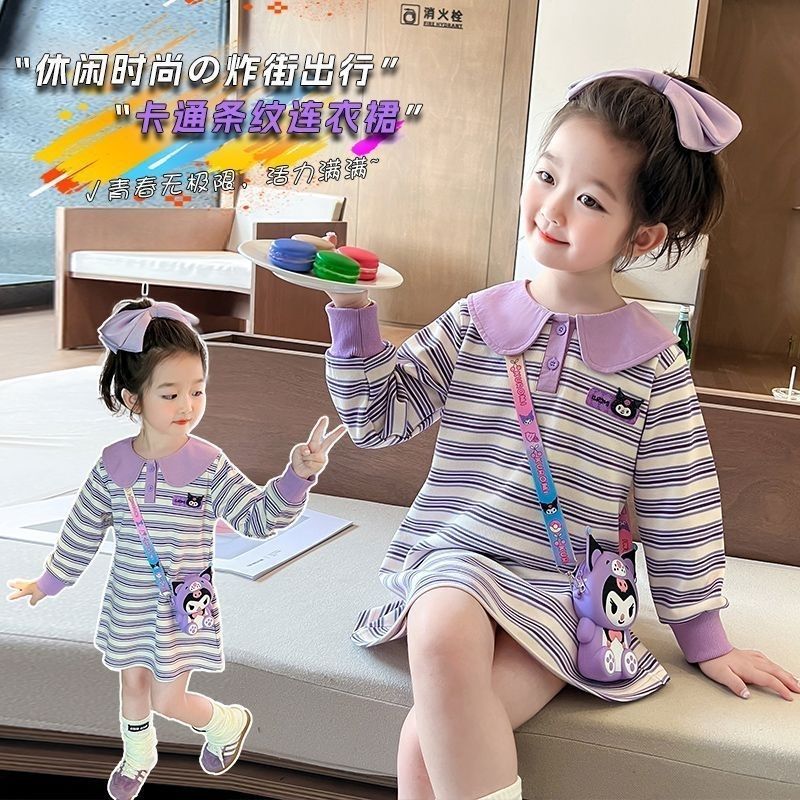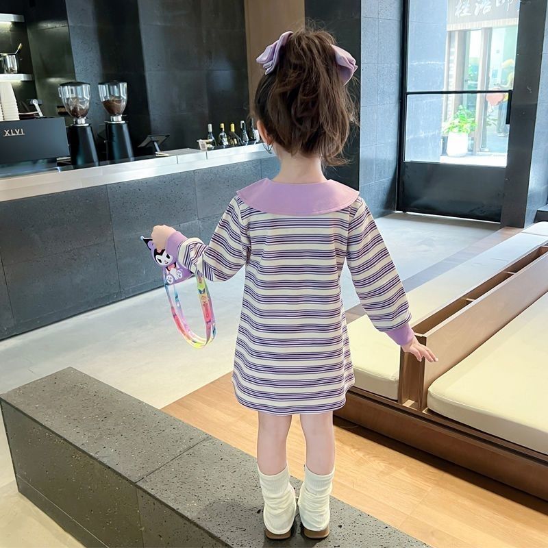 女小童秋季长袖条纹连衣裙女宝宝韩版时尚卫衣裙卡通库洛米公主裙