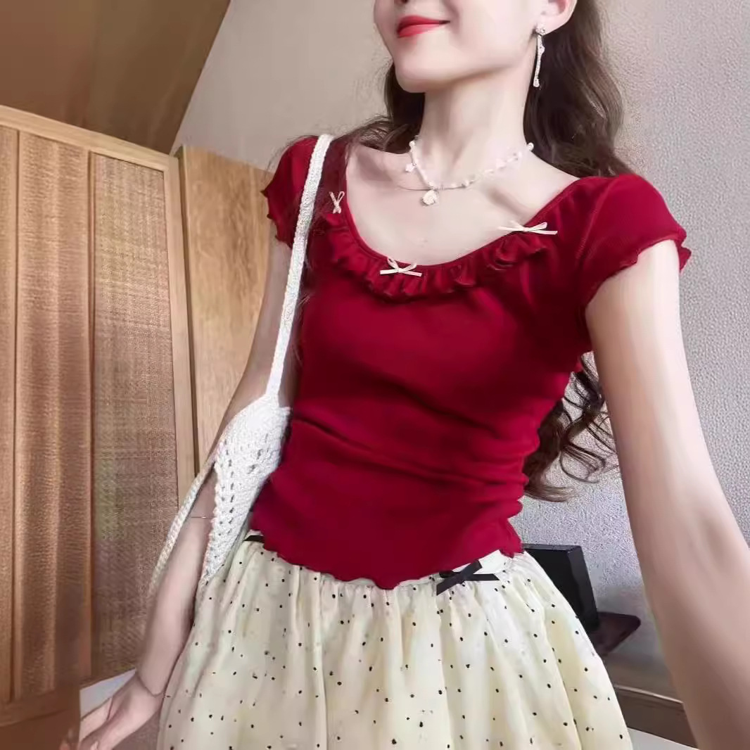 甜辣纯欲木耳性感花边低领修身短袖T恤夏季辣妹短款红色耳边上衣