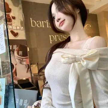 2025小众一字肩纯欲风粉色秋冬蝴蝶结露肩短款甜辣妹性感上衣ins