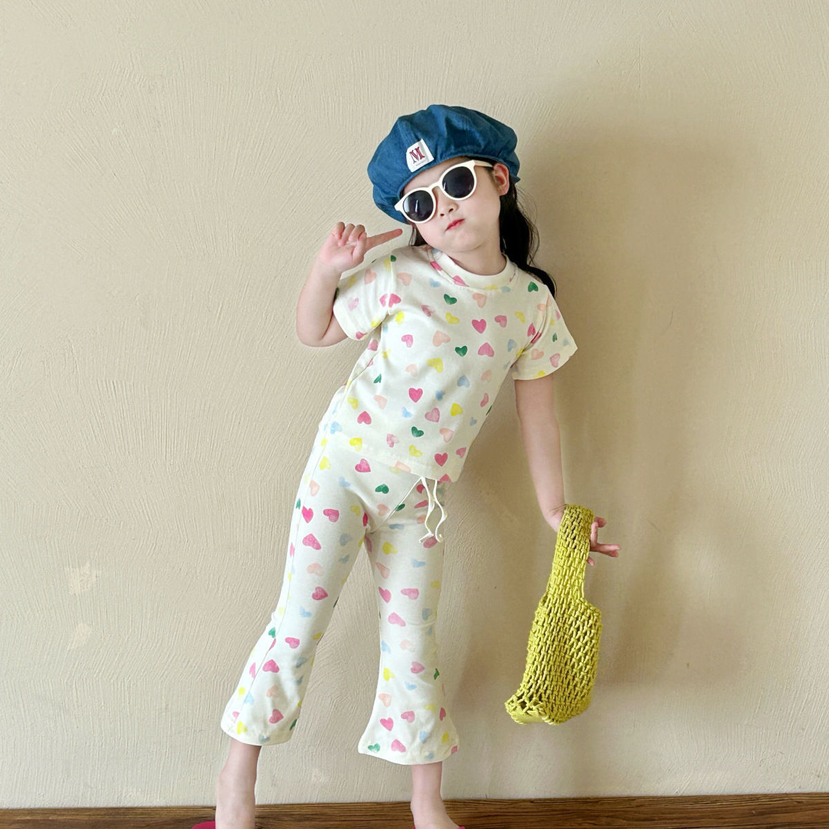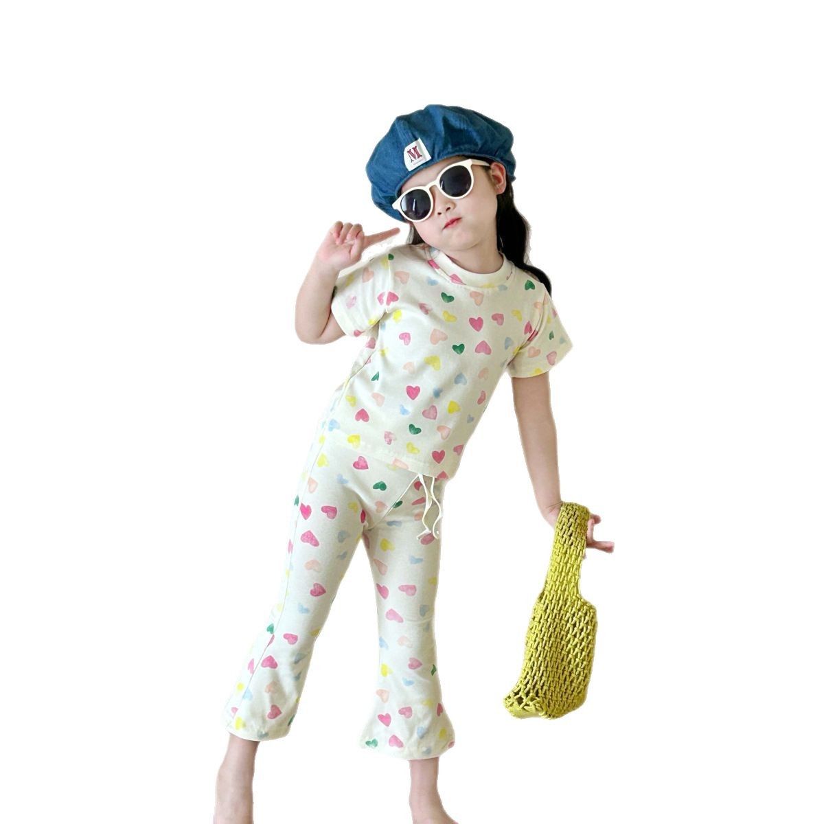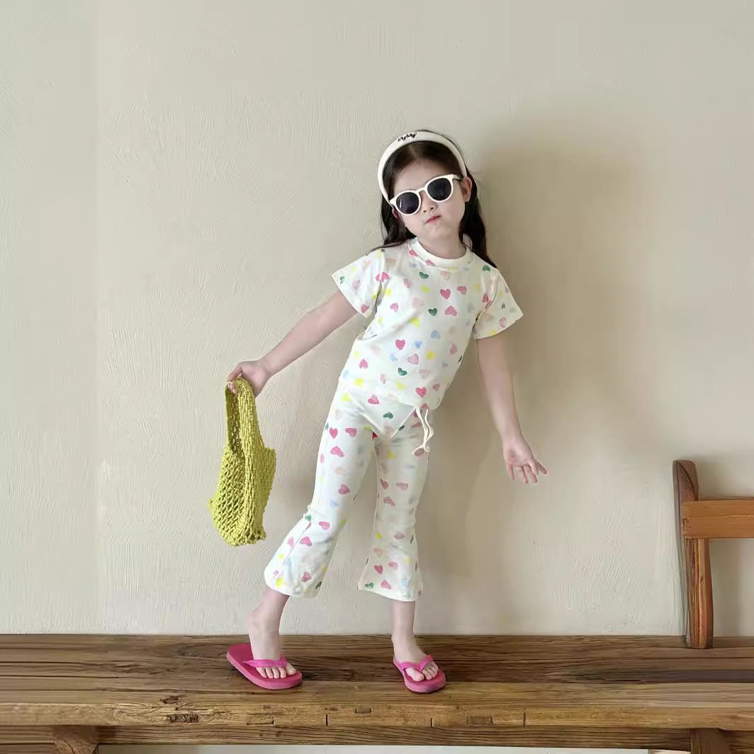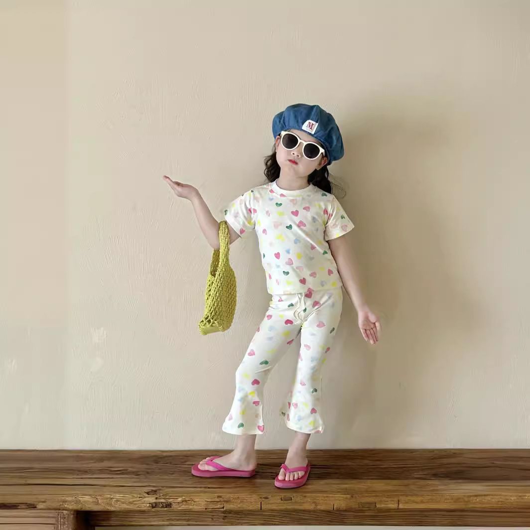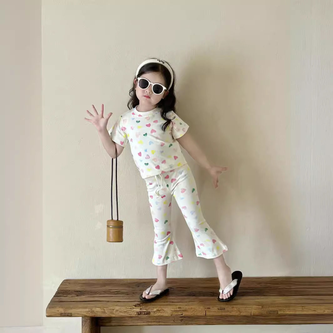 女孩气彩色爱心针织套装夏款女孩修身可爱短袖喇叭裤弹力两件套