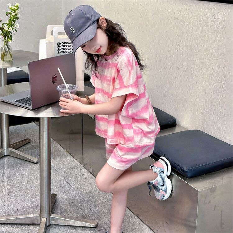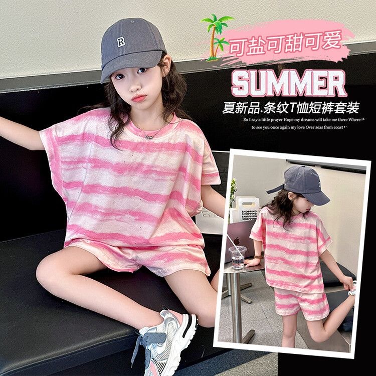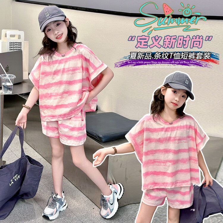 女童撒银粉条纹扎染运动套装夏装新款小女孩蝙蝠衫上衣短裤两件套