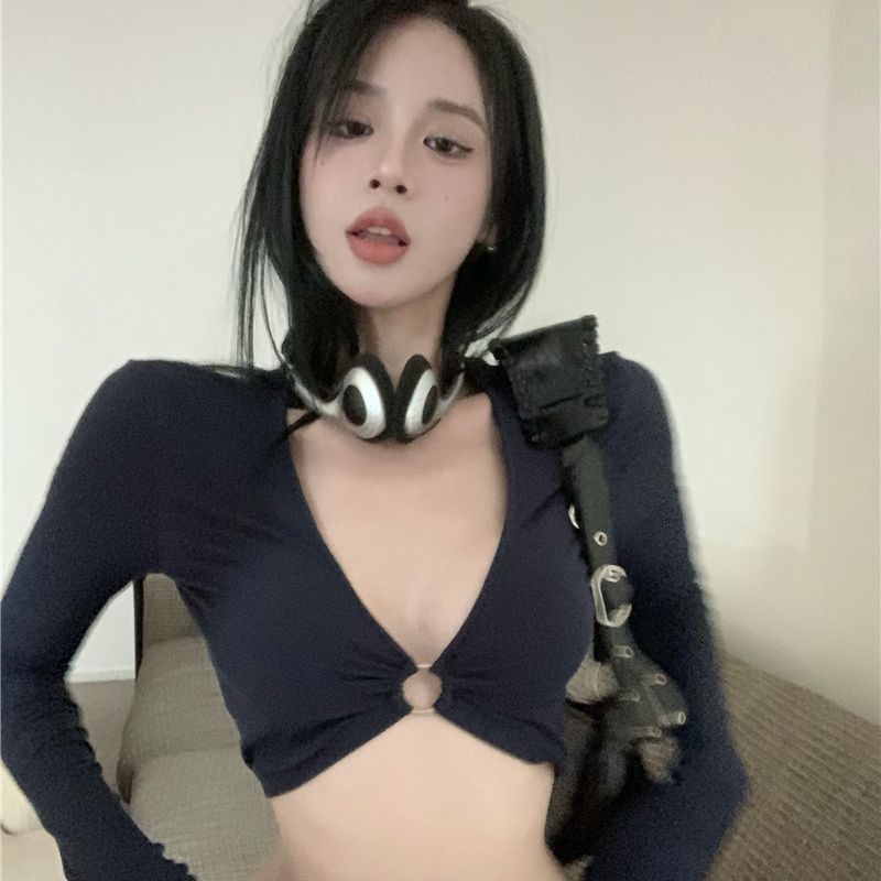 螺纹辣妹黑色长袖T恤女夏季紧身性感别致短款露脐内搭打底上衣女