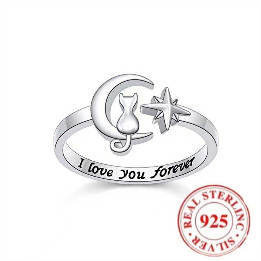 925S纯银猫月亮个性戒指我永远爱你可调节低过敏女士开口戒指