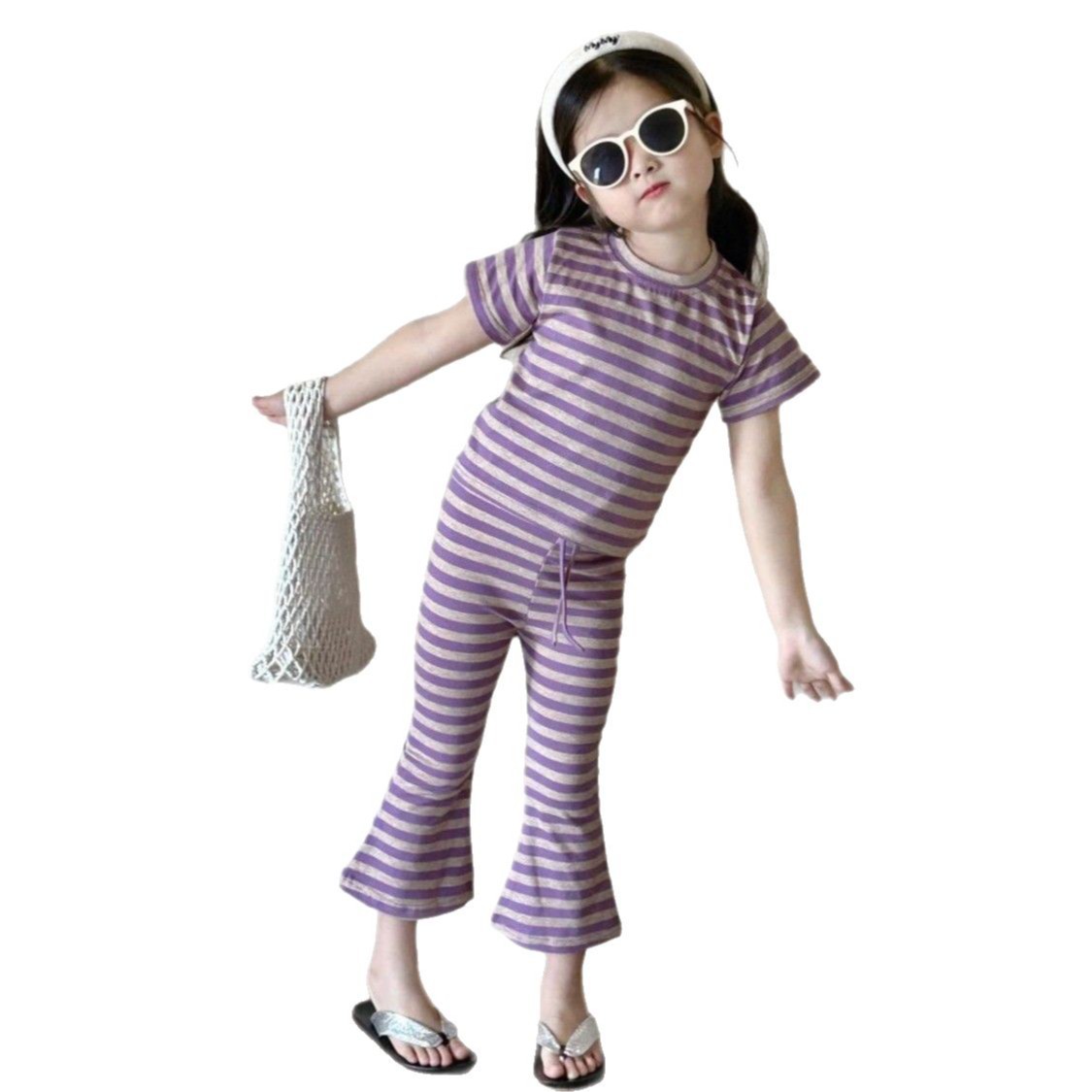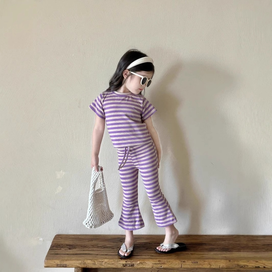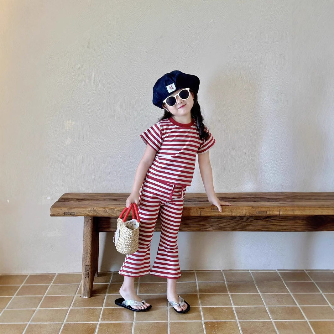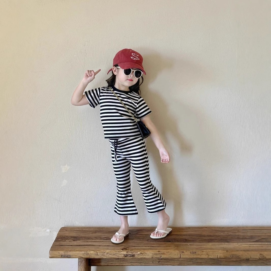 女童夏季套装女孩短袖新款条纹上衣洋气休闲喇叭裤两件套童装显瘦