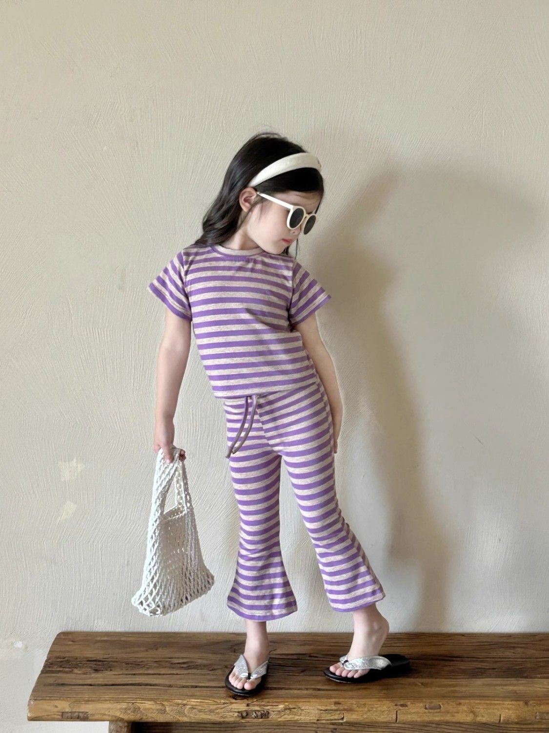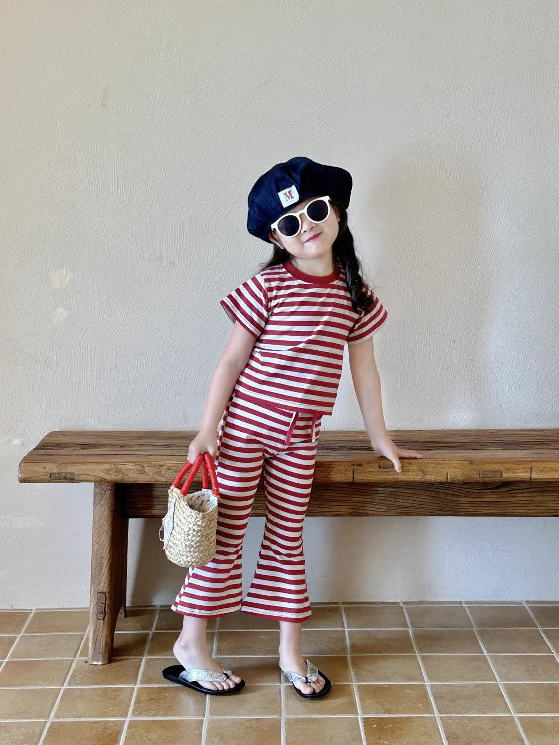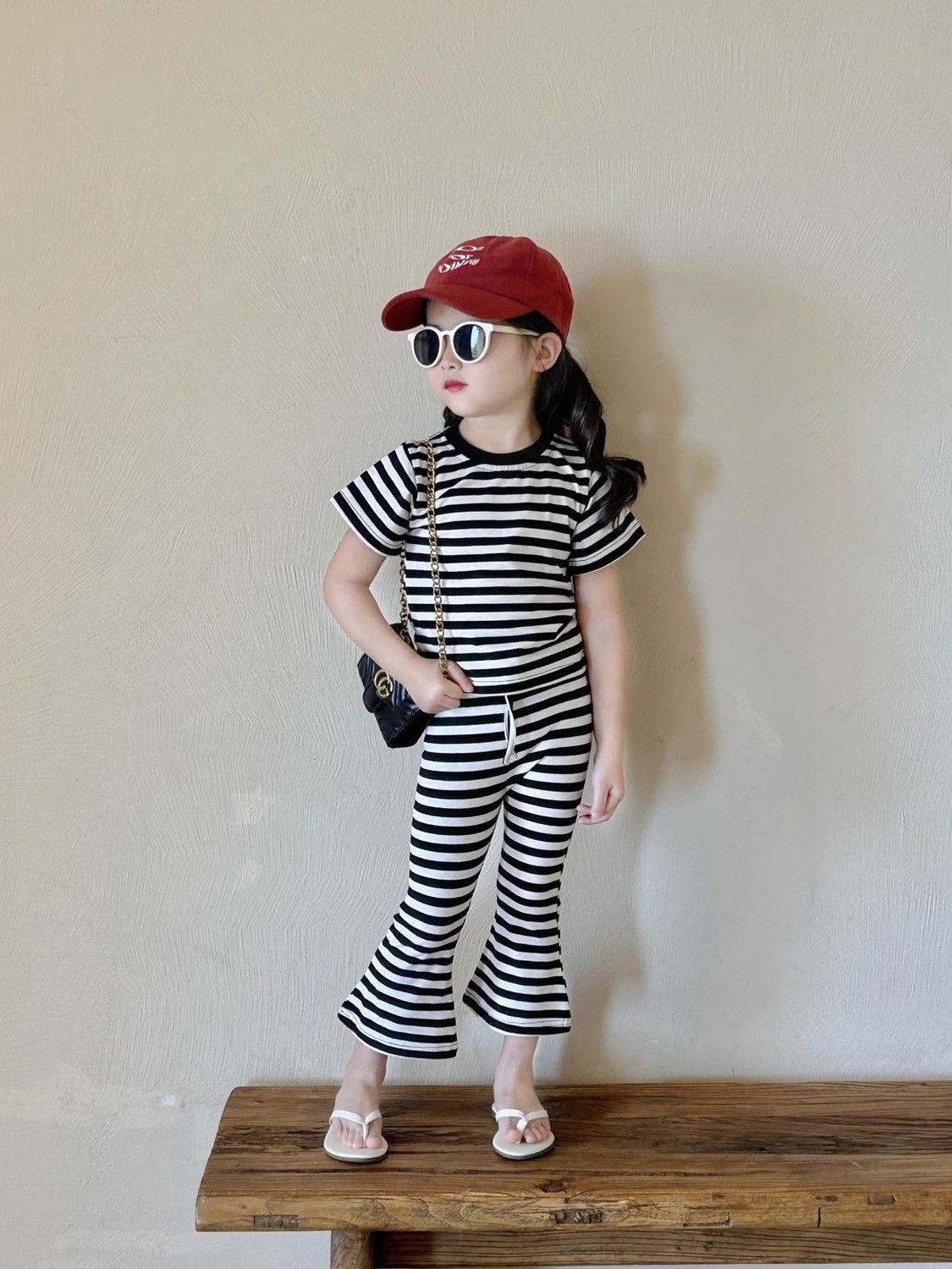 女童夏季套装女孩短袖新款条纹上衣洋气休闲喇叭裤两件套童装显瘦