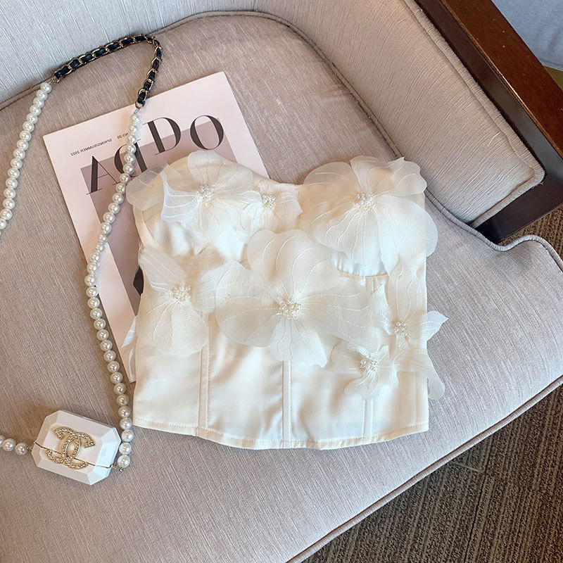 法式设计感网纱花朵抹胸背心女装夏时尚修身l甜辣风绝美上衣