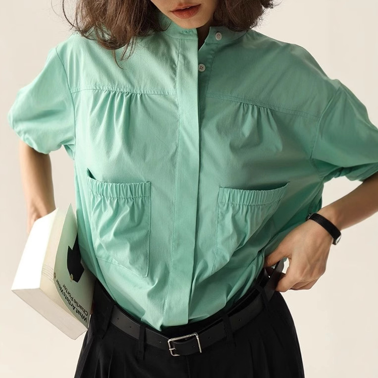夏季女纯色新款法式大口袋宽松小立领纯色短袖衬衣