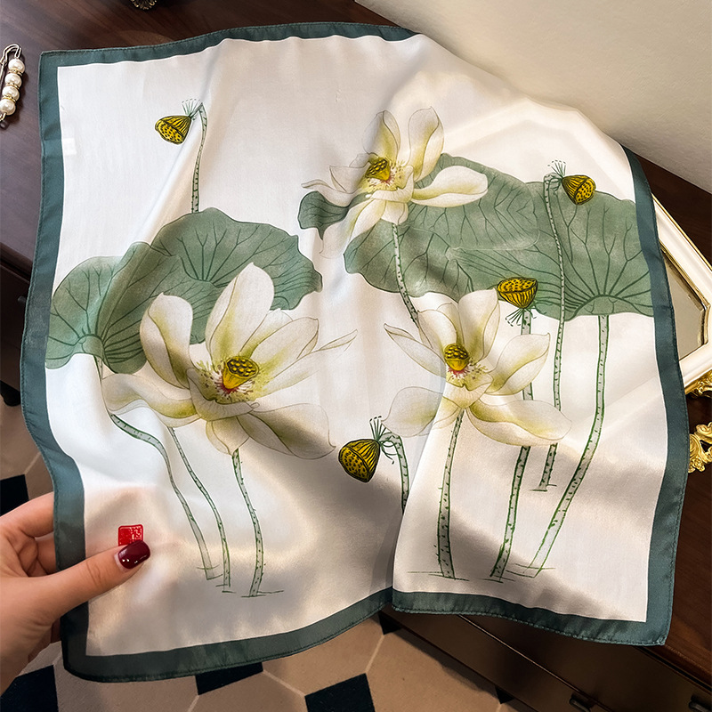 新款53真丝小丝巾女春季百搭时尚荷花桑蚕丝丝巾优雅素绉缎方巾