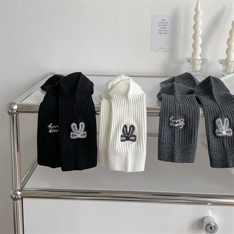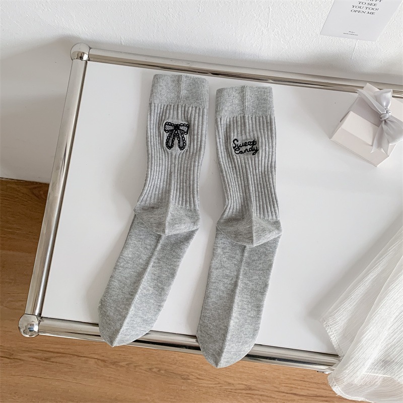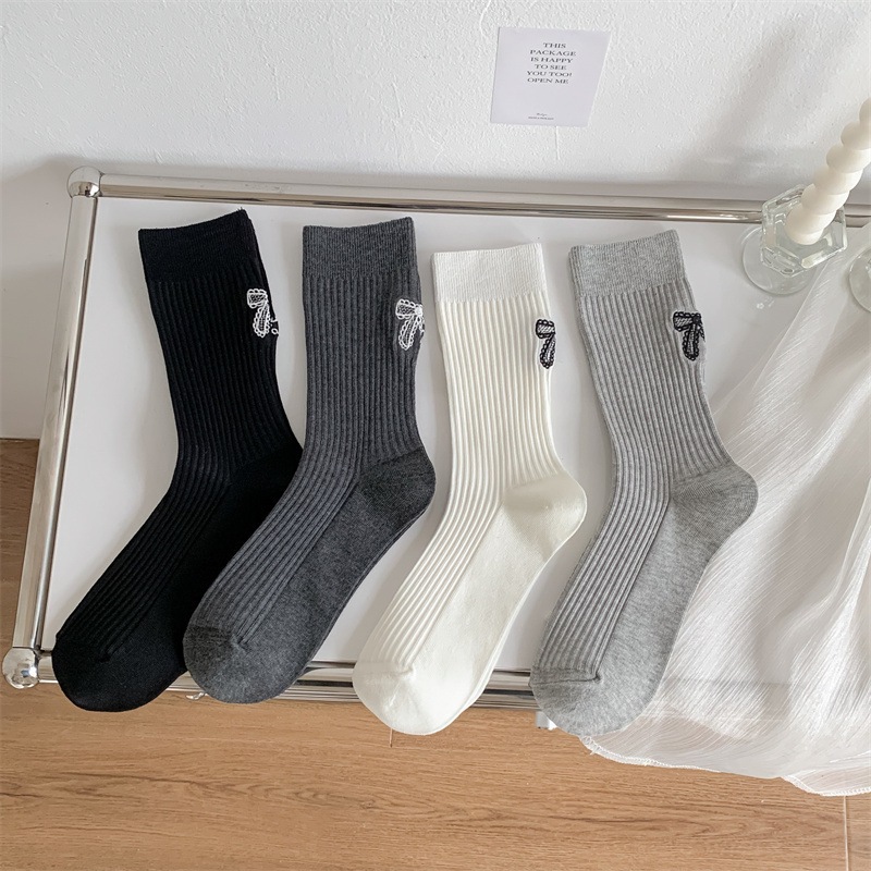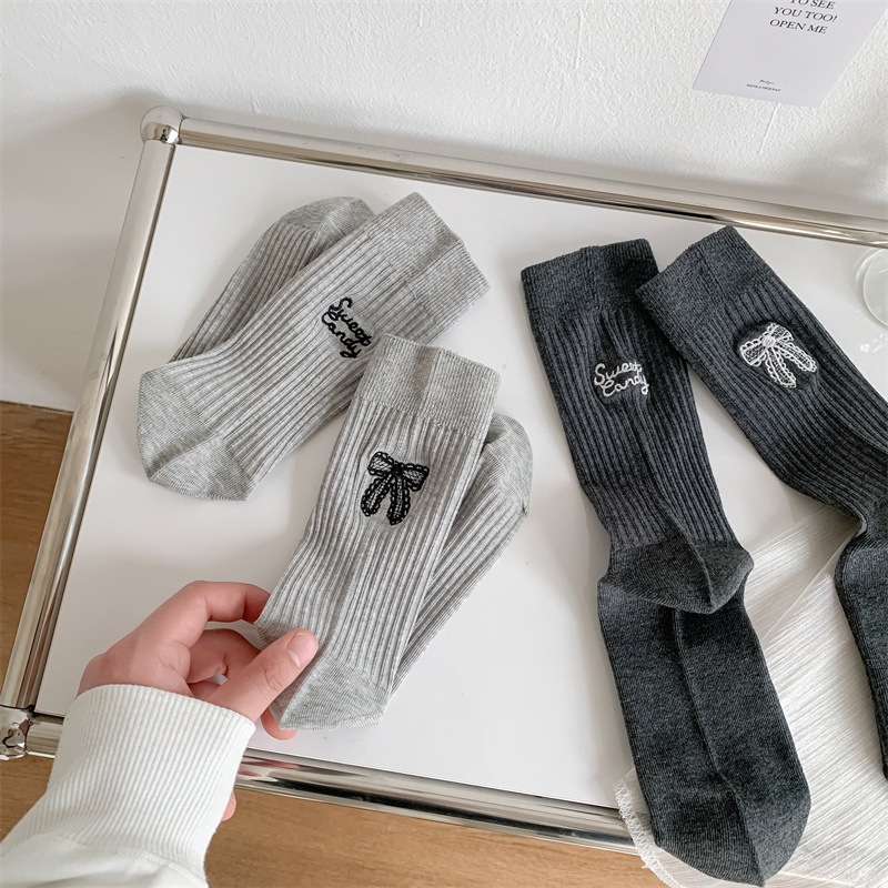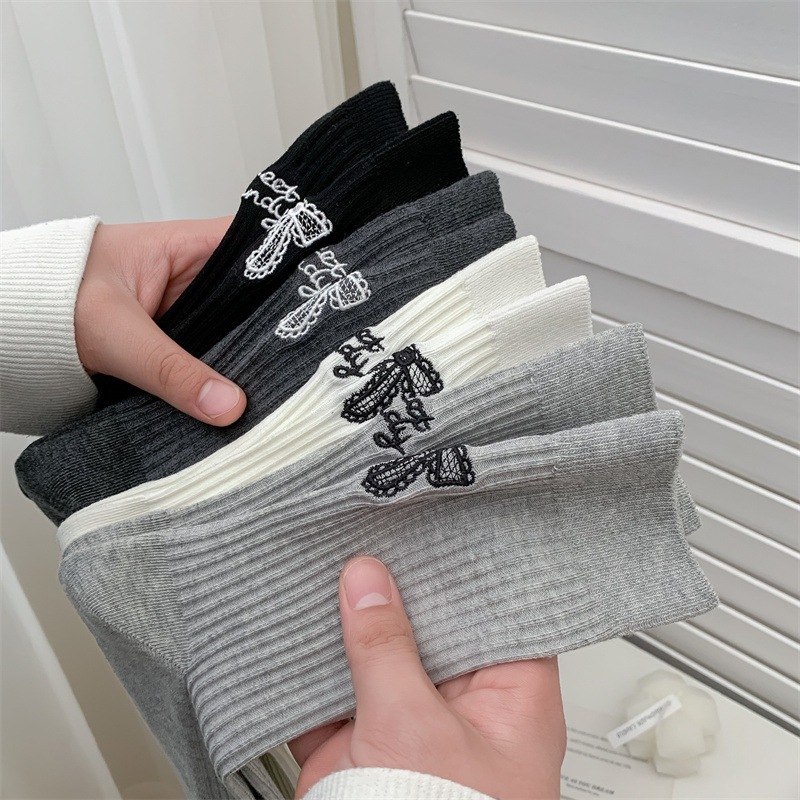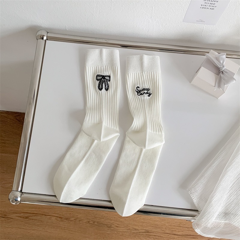 2025春夏新款日系高级感蝴蝶结双针堆堆袜中筒袜子AB刺绣棉袜女袜