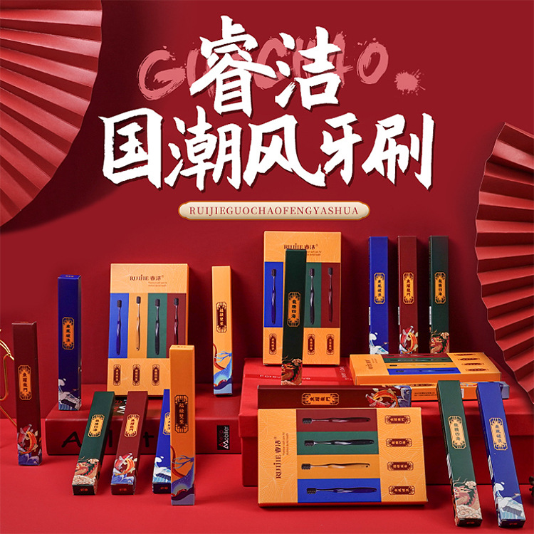 睿洁国潮宫廷风古风瓷感彩炭毛家用成人牙刷一盒四支装百货