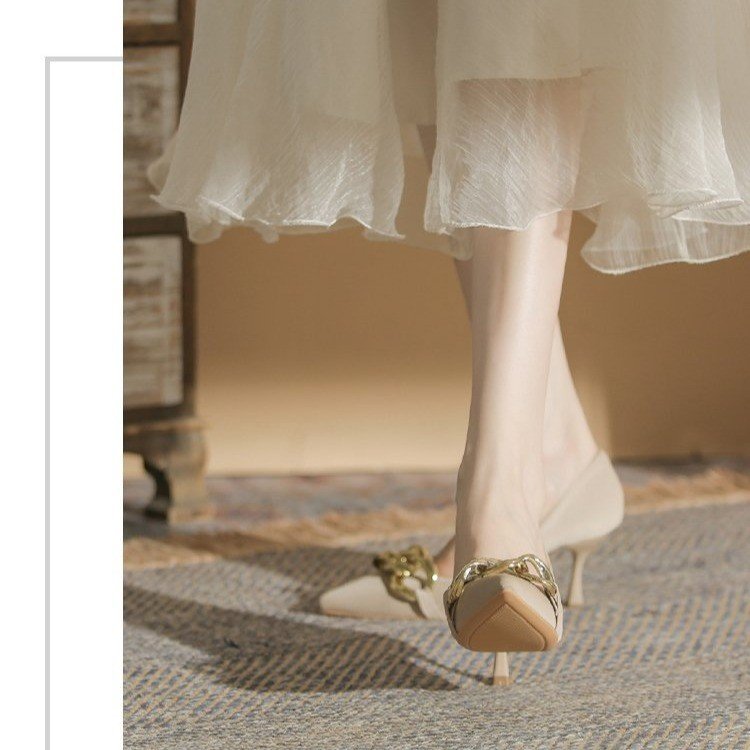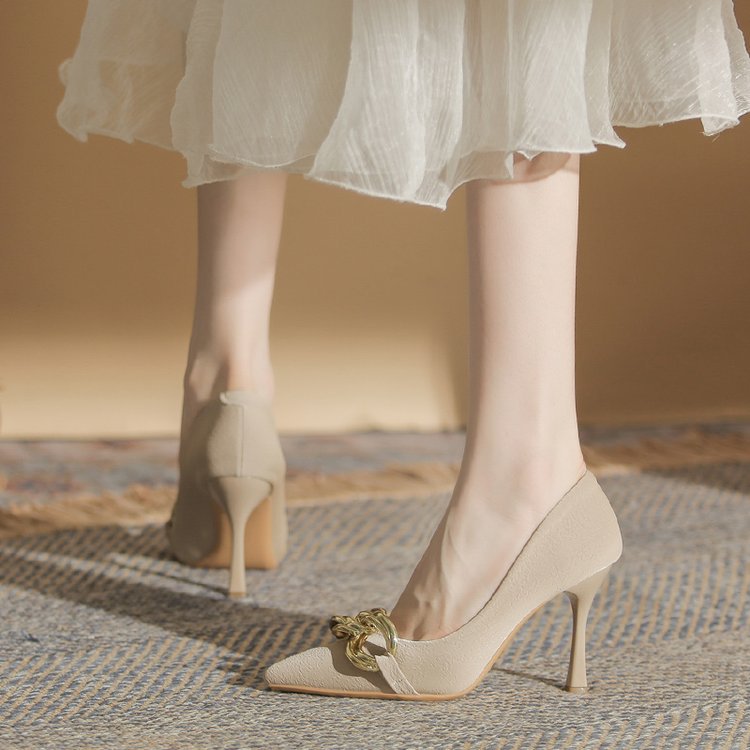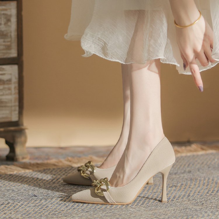 高跟鞋细跟气质名媛春季新款金属链条欧美风尖头单鞋女浅口