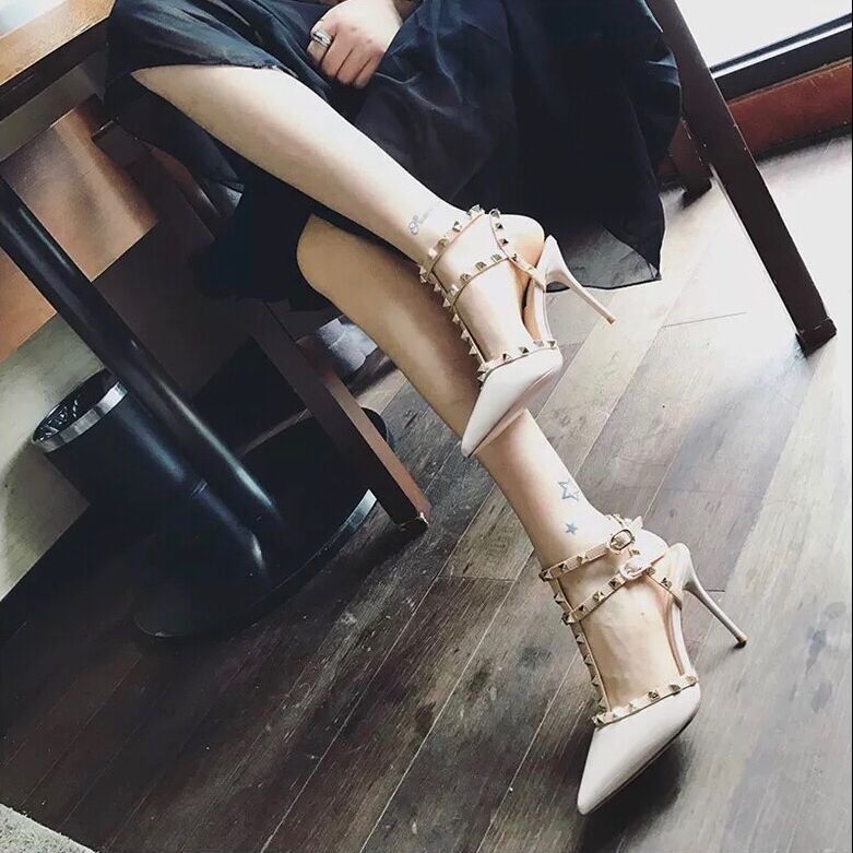 名媛风性感时尚细跟高跟鞋春季铆钉尖头凉鞋女一字扣带单鞋子