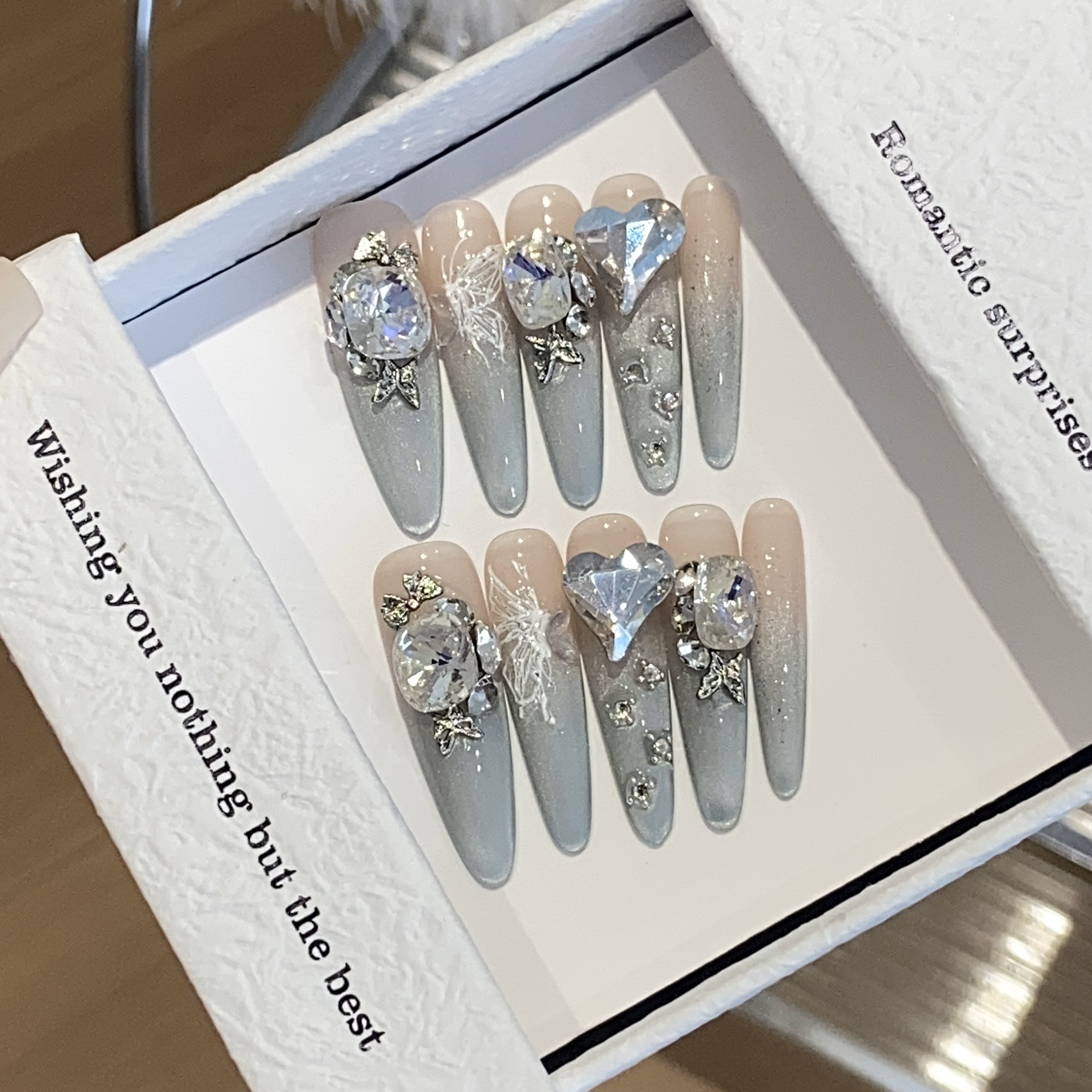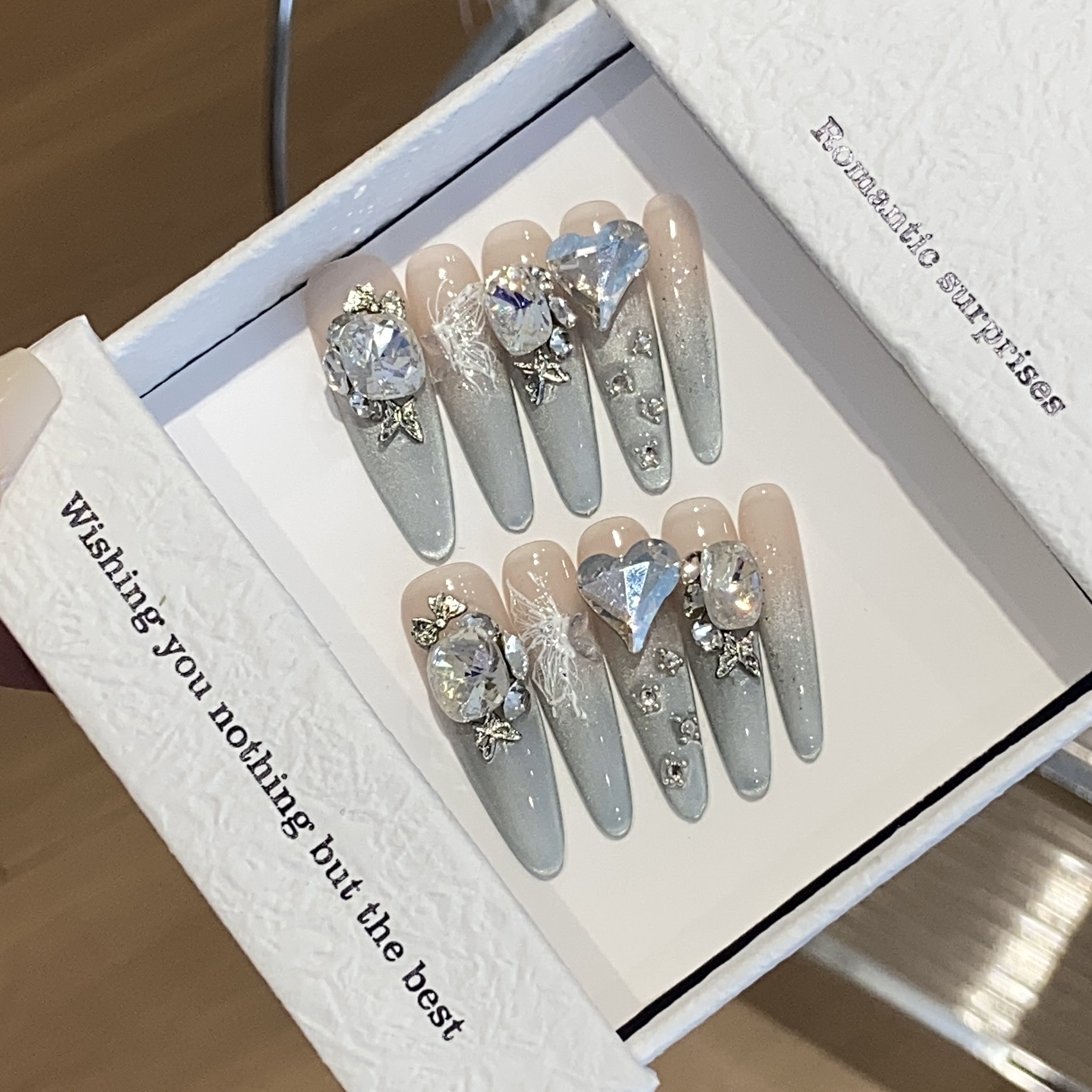 纯手工秋款穿戴甲炫彩蓝色蝴蝶贴钻重工美甲显白光疗美甲片可拆卸
