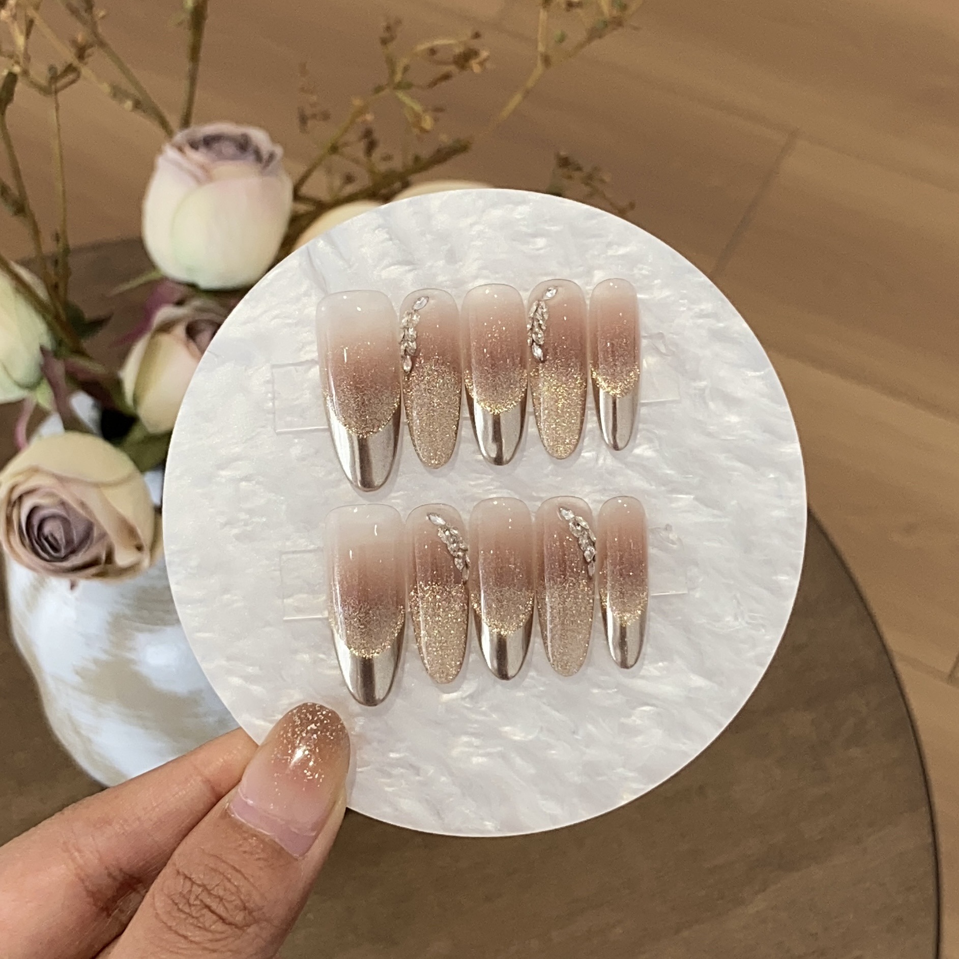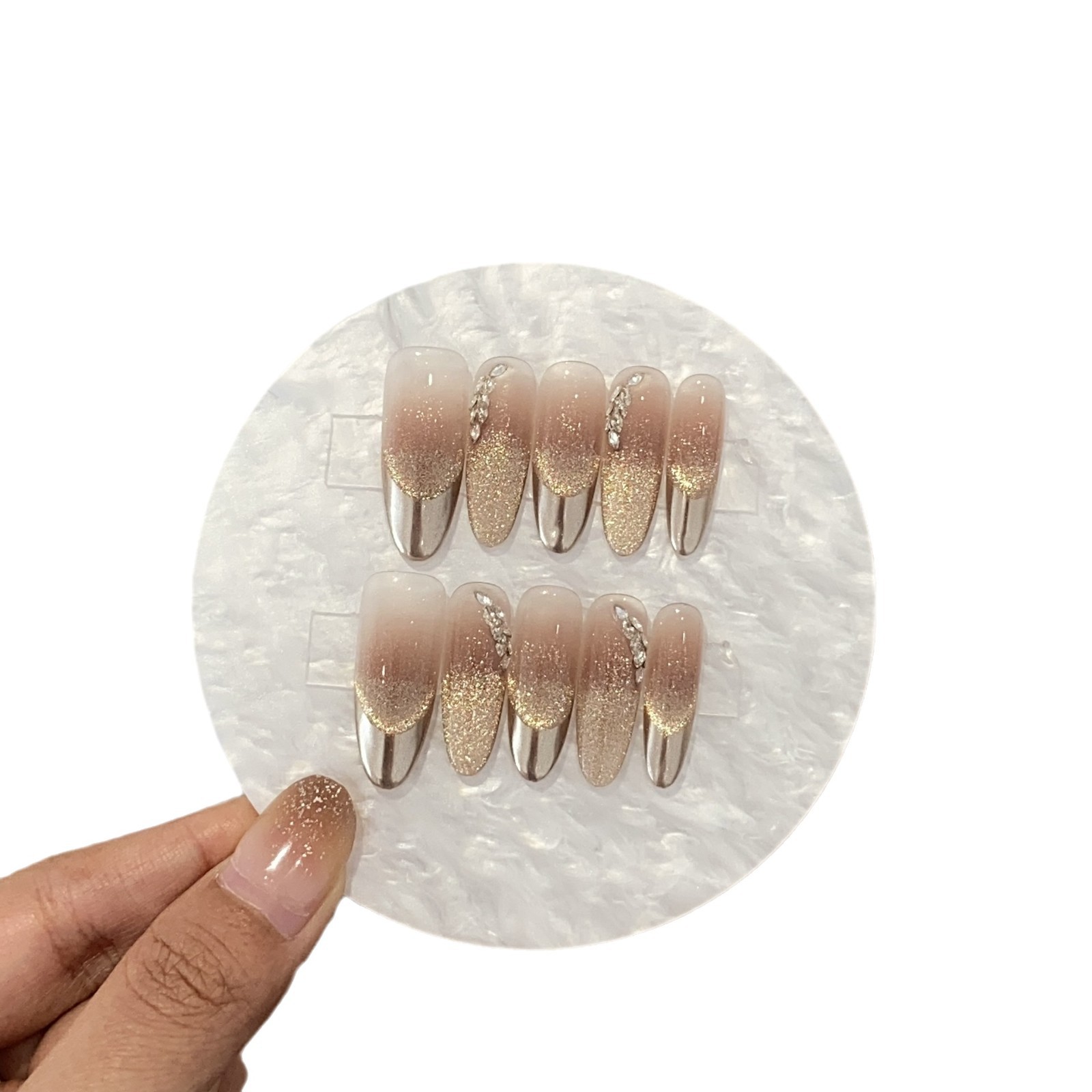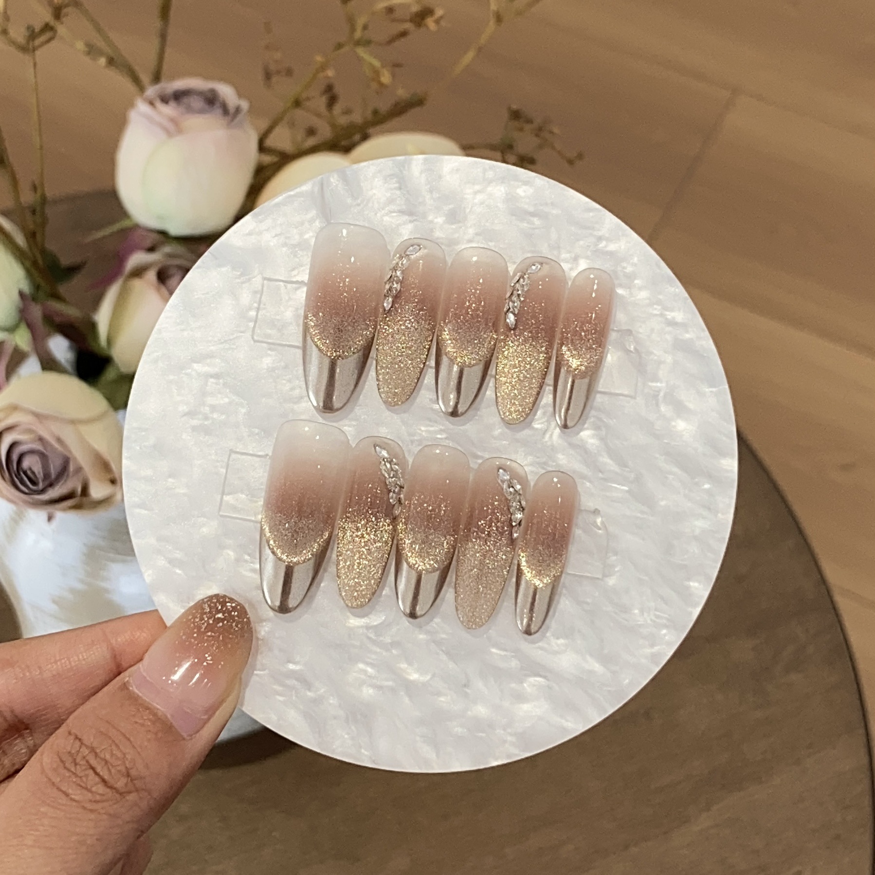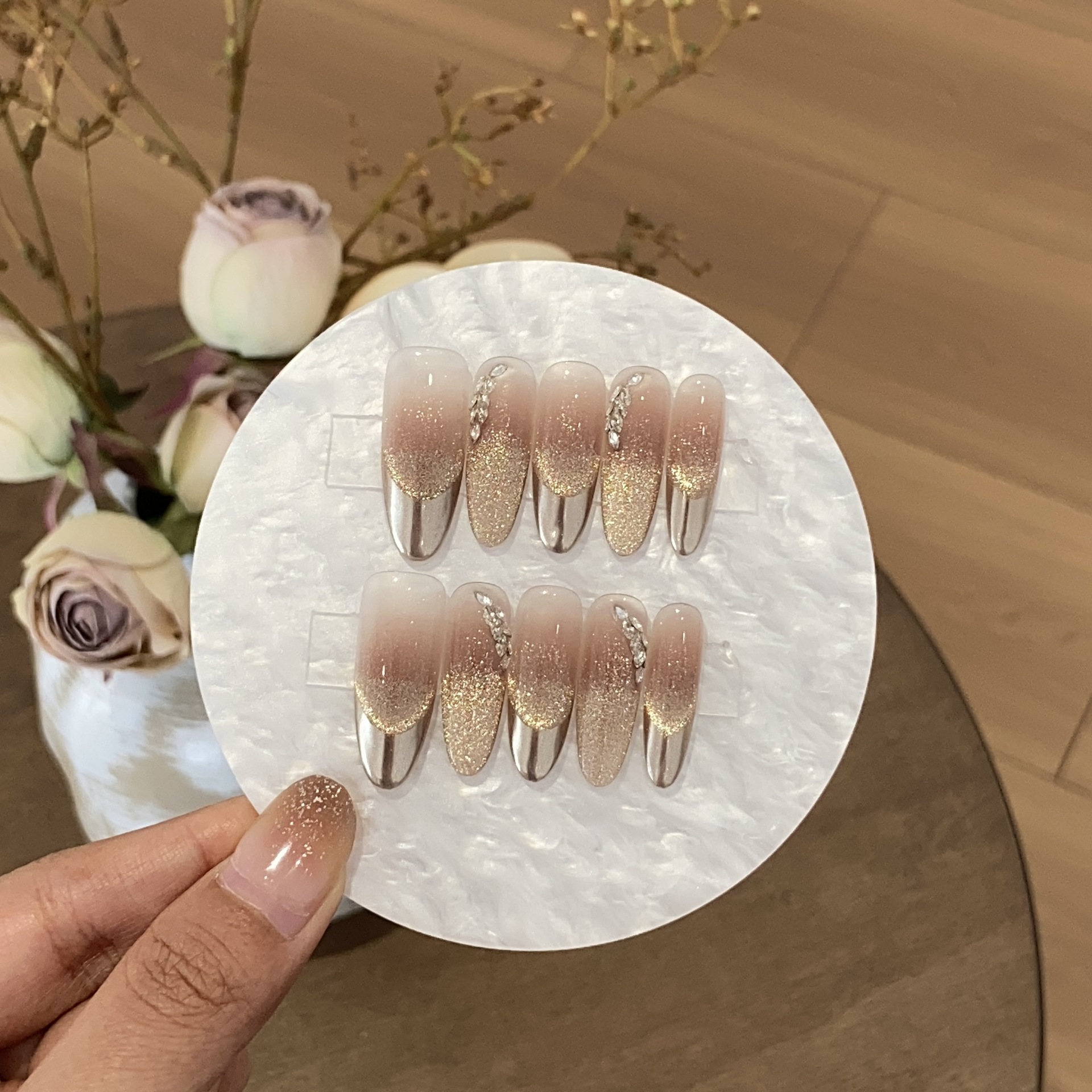一只顾美甲 手工金色爆闪渐变法式魔镜粉麦穗柏拉图金泪穿戴甲