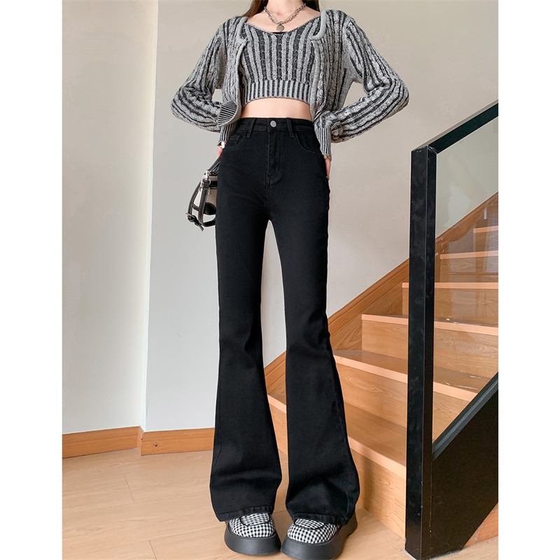 铭海黑色高弹微喇叭牛仔裤女显瘦秋季新款修身小个子马蹄长裤