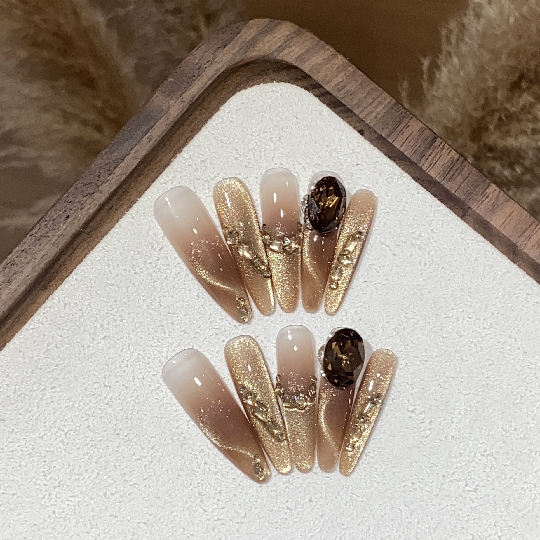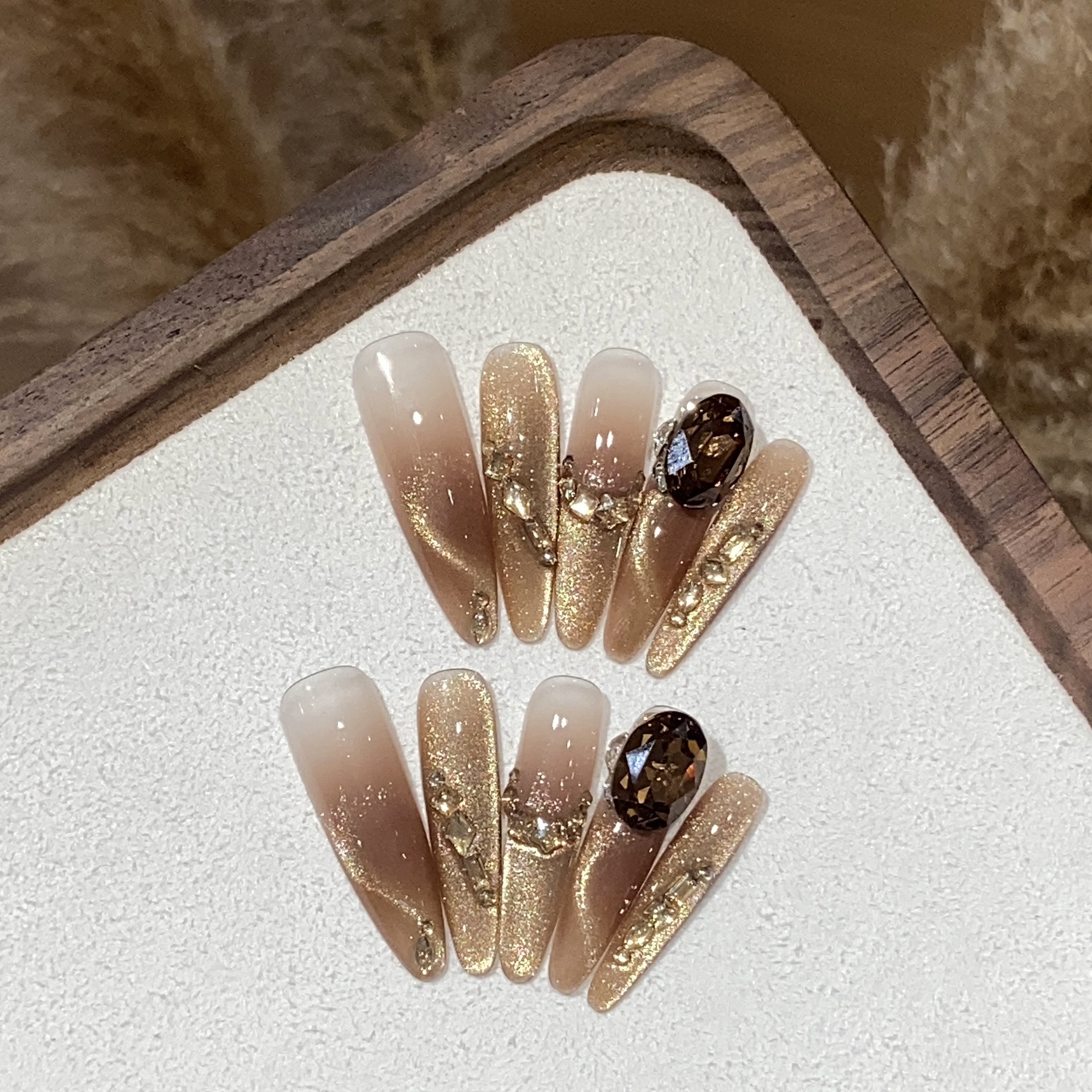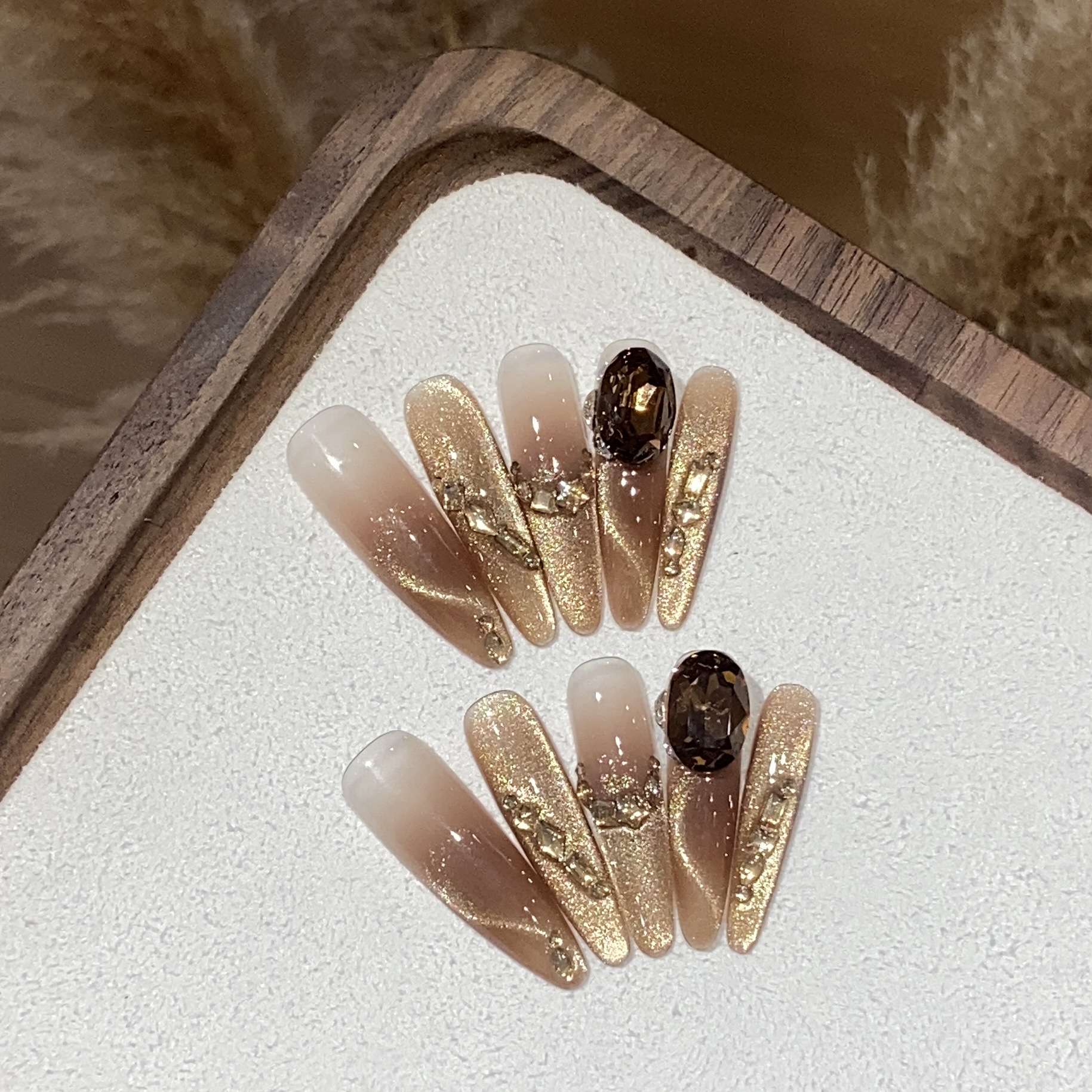 一只顾美甲 美拉德冰透爆闪金色飘带猫眼小碎钻美拉焦糖穿戴甲片