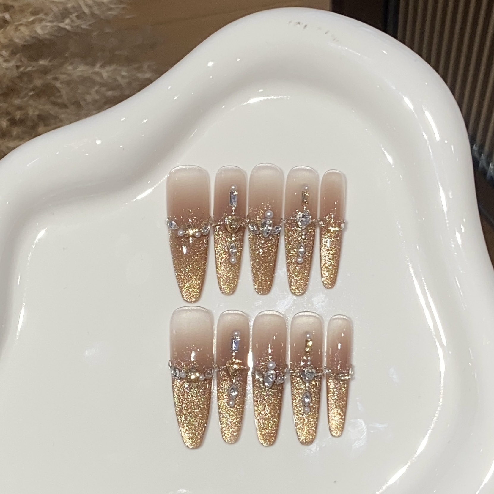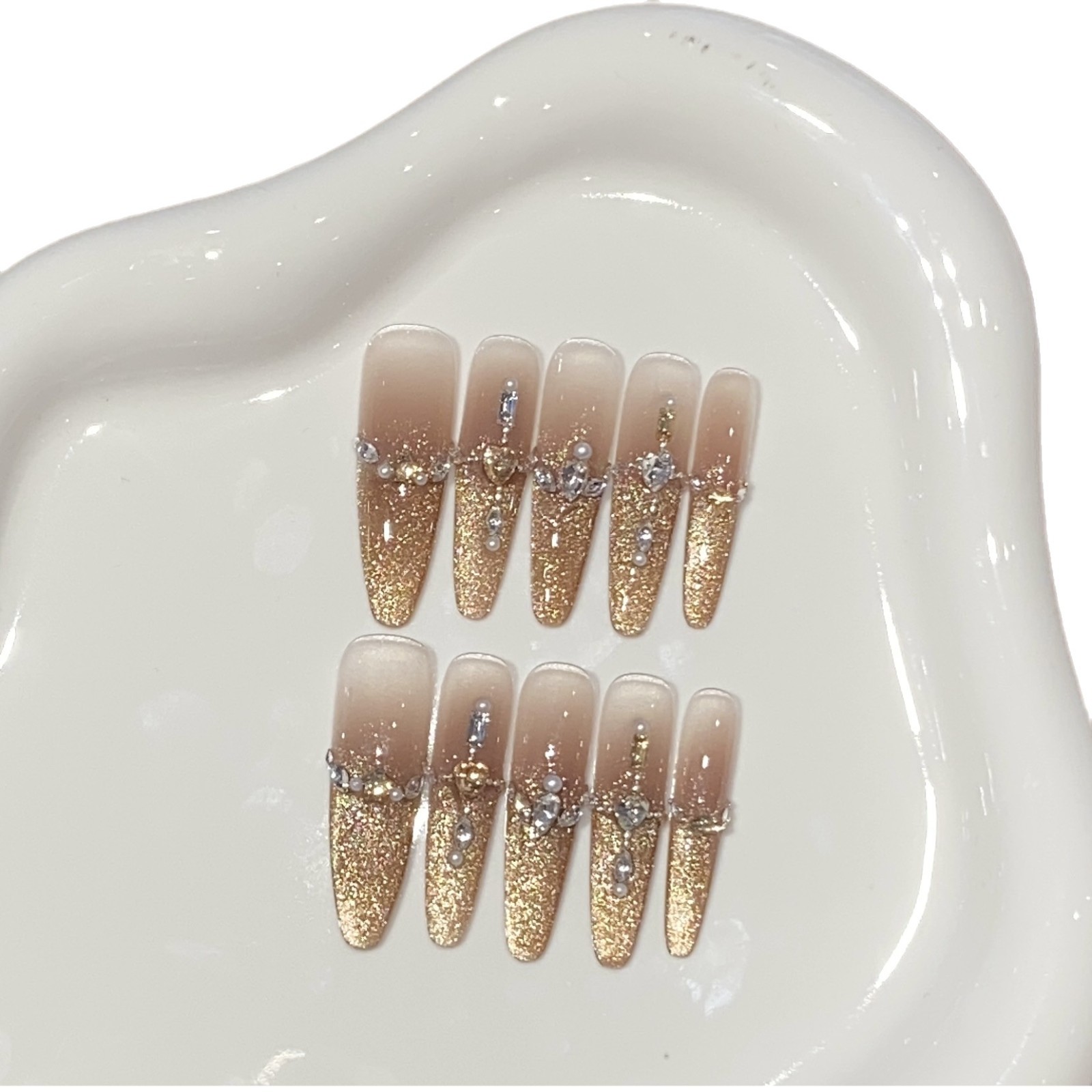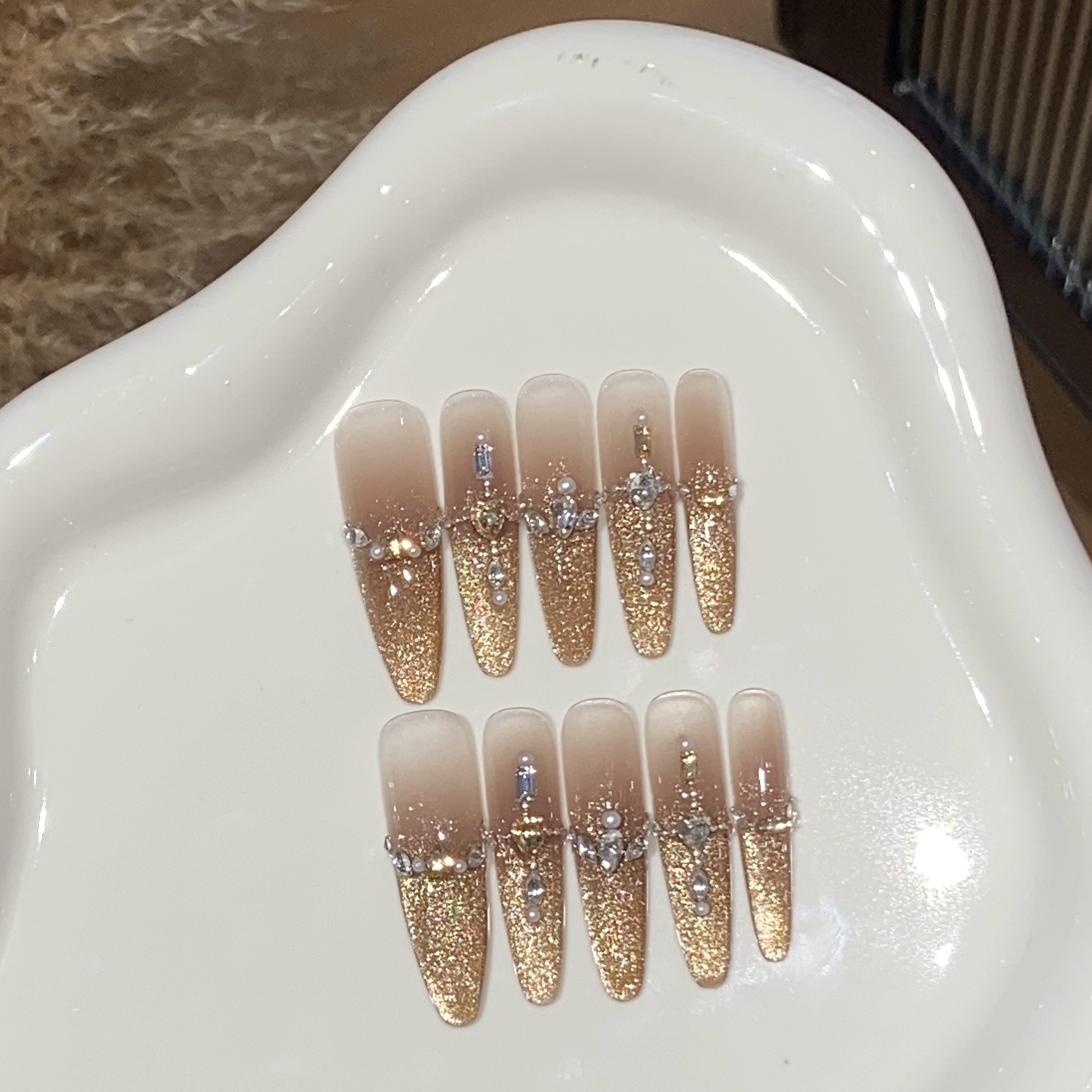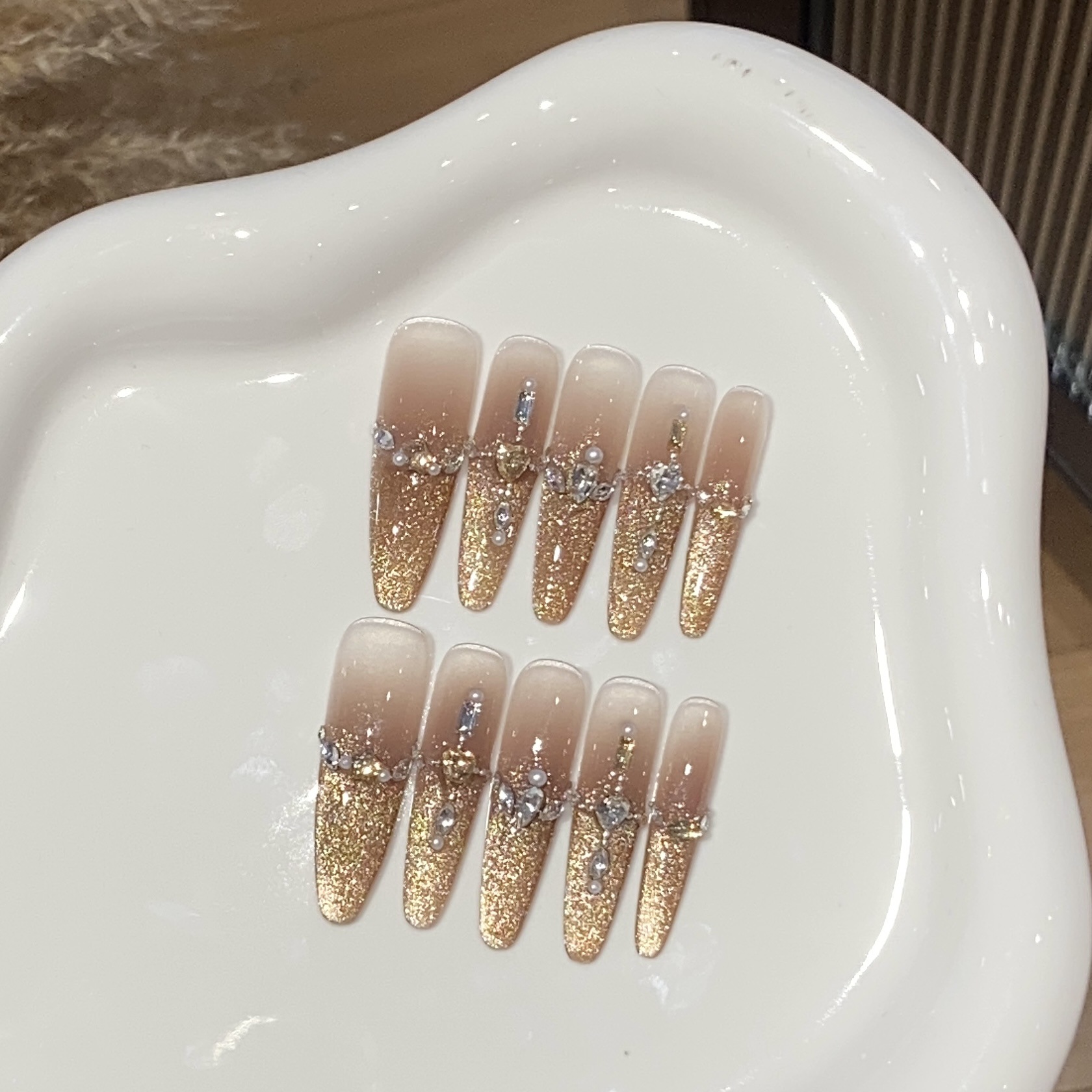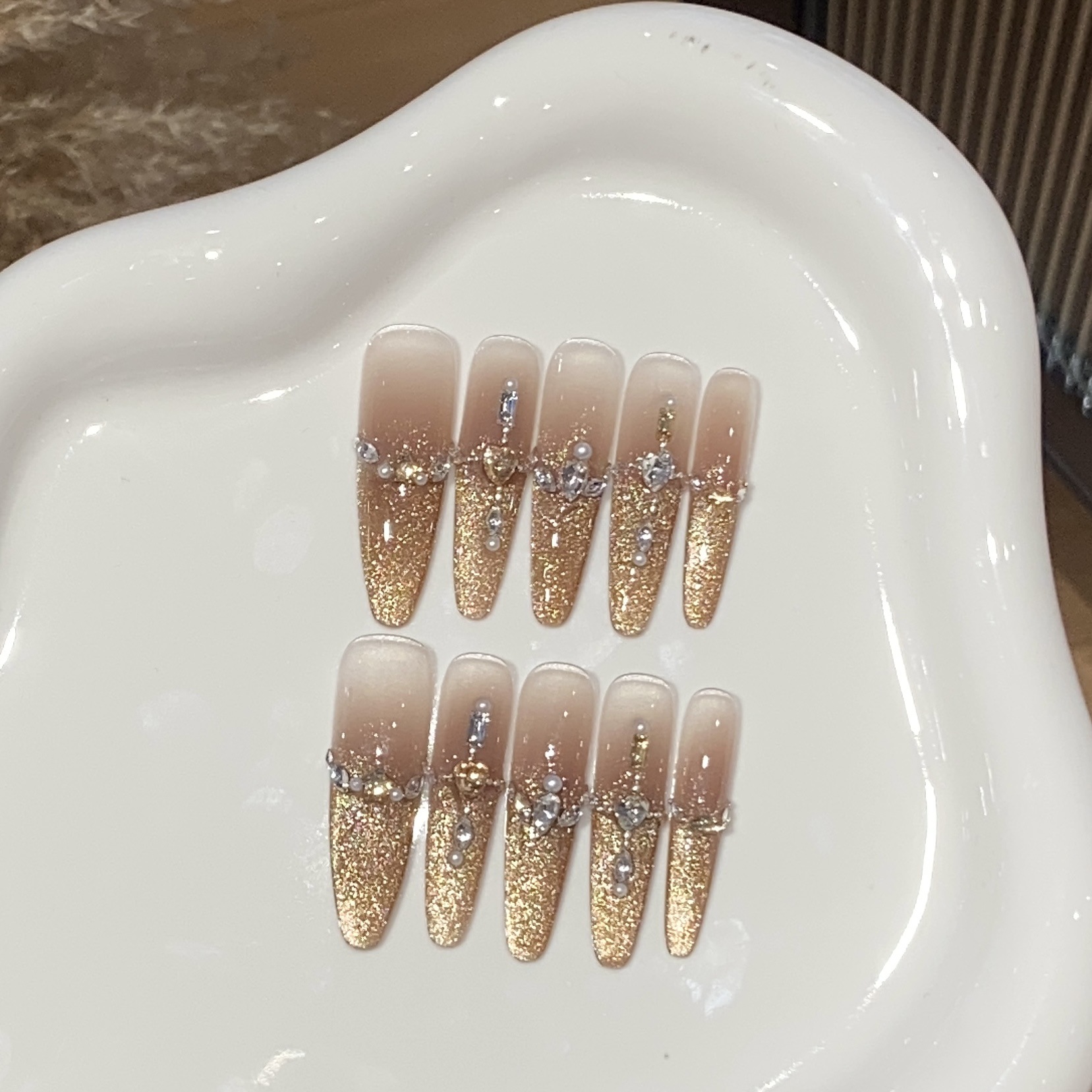 一只顾美甲 金色爆闪猫眼渐变珍珠小碎钻打翻宝石盒可拆卸穿戴甲