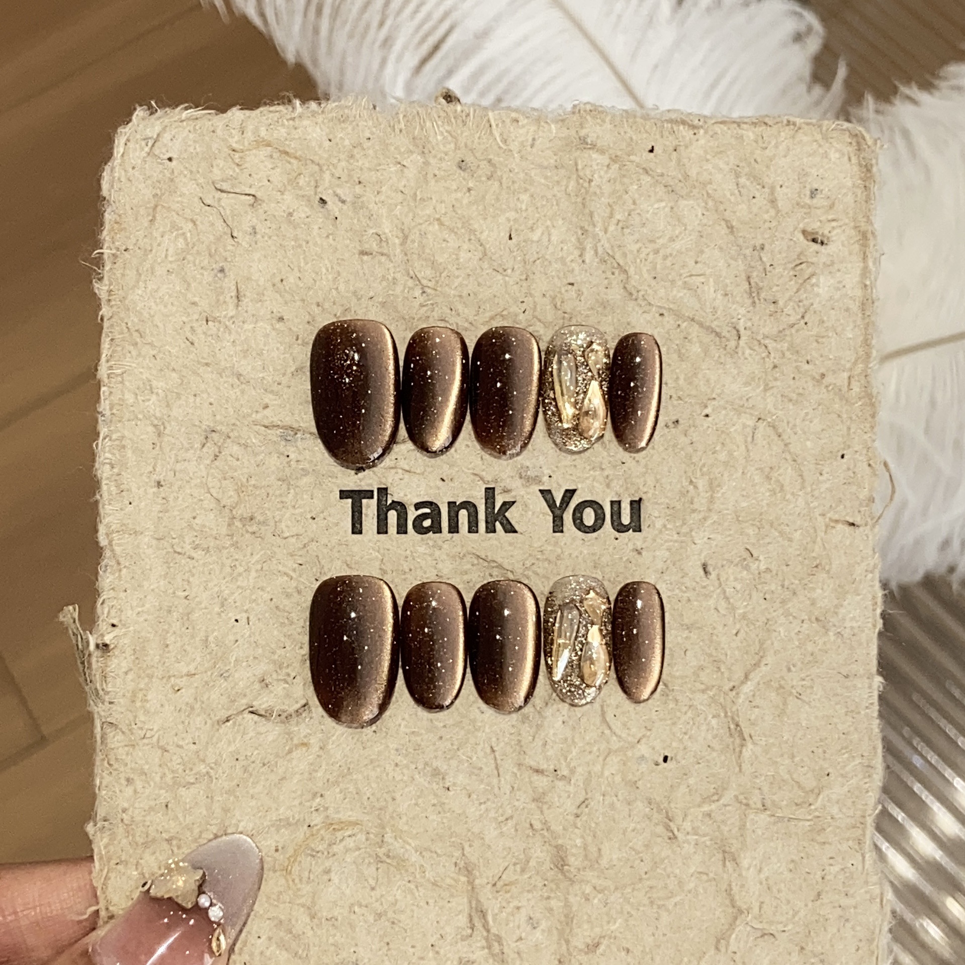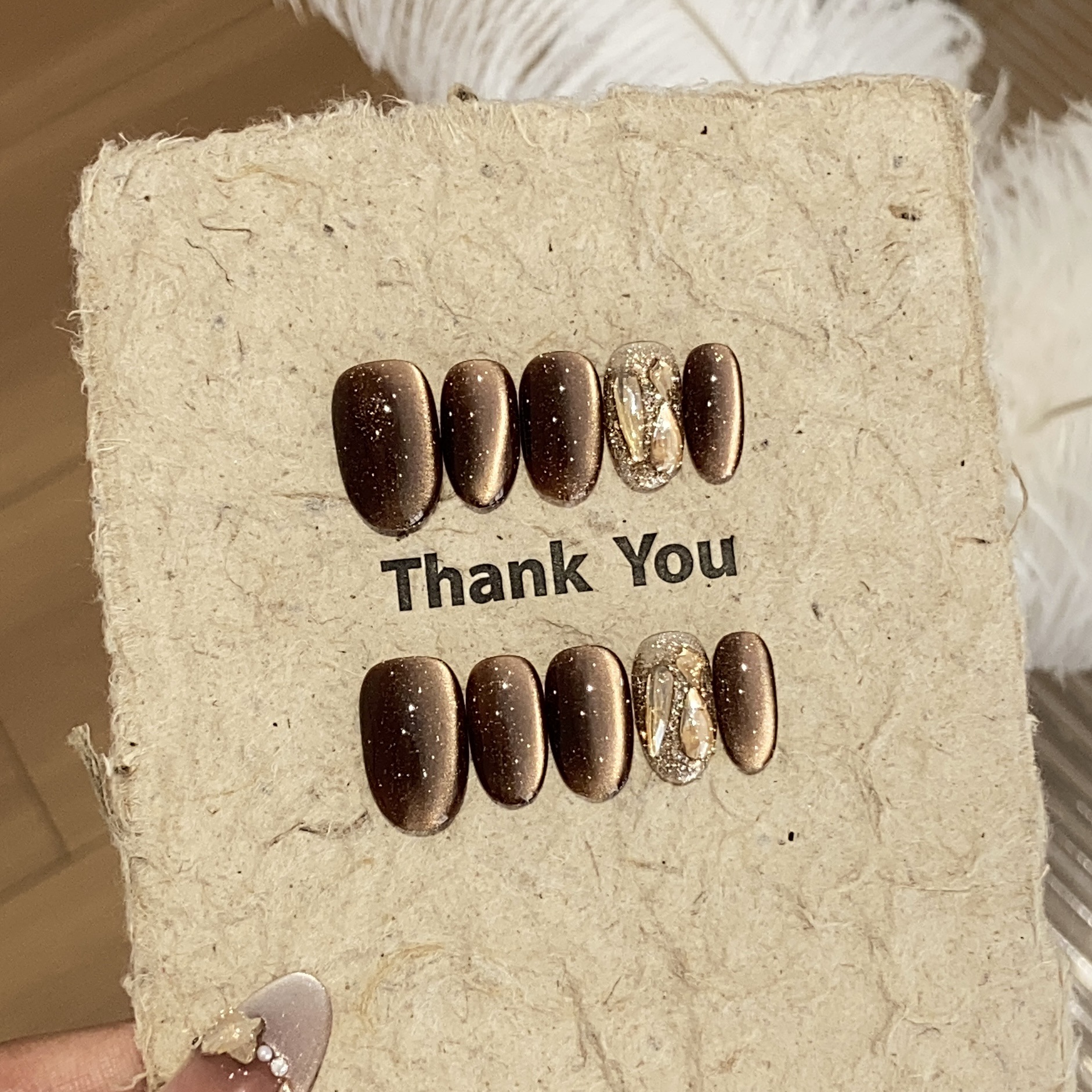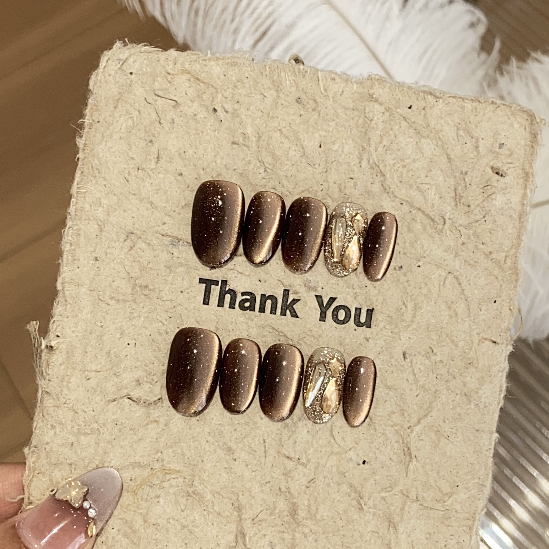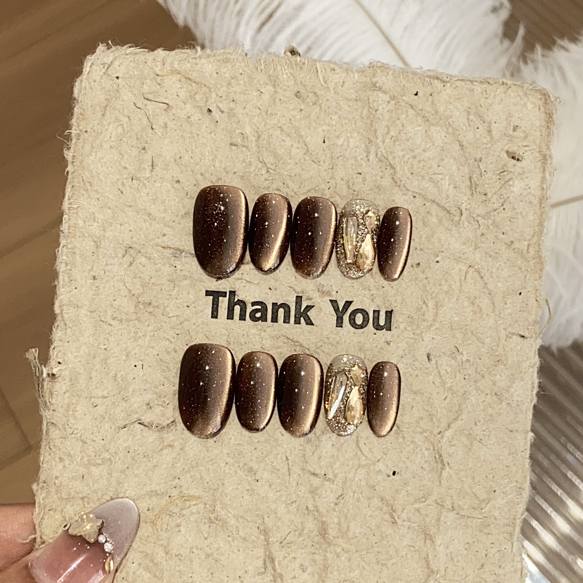 一只顾美甲 【Y】手工焦糖咖啡侧光猫眼金色爆闪碎钻焦糖泡泡穿戴