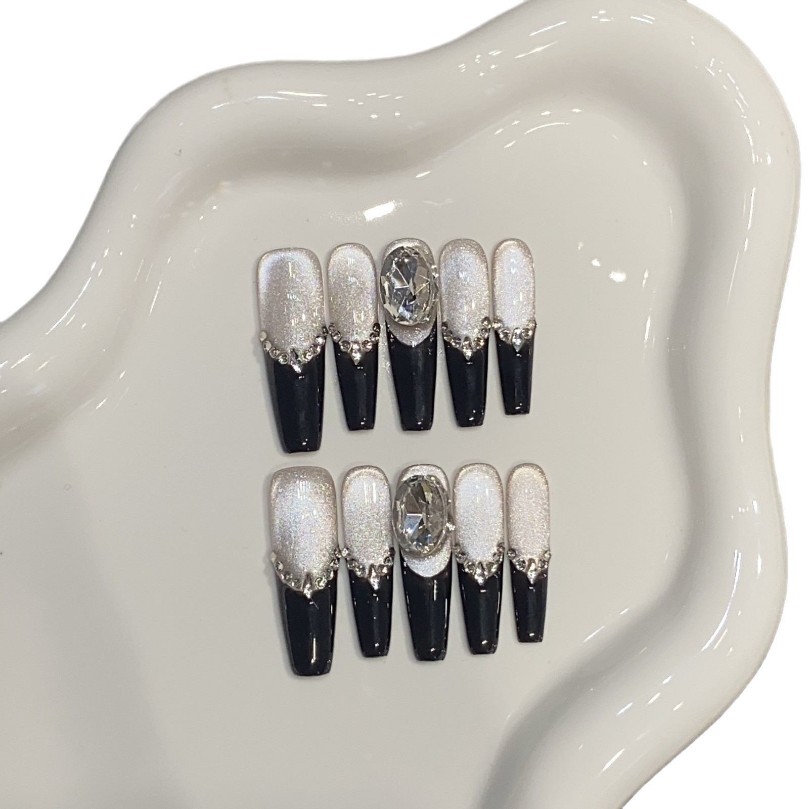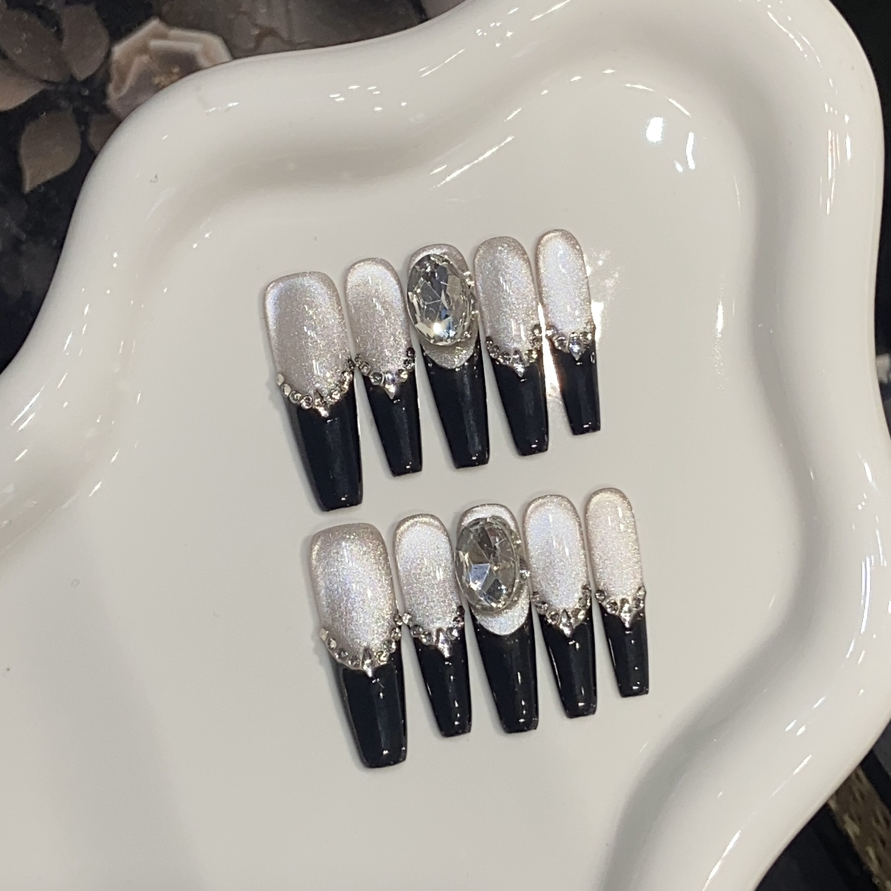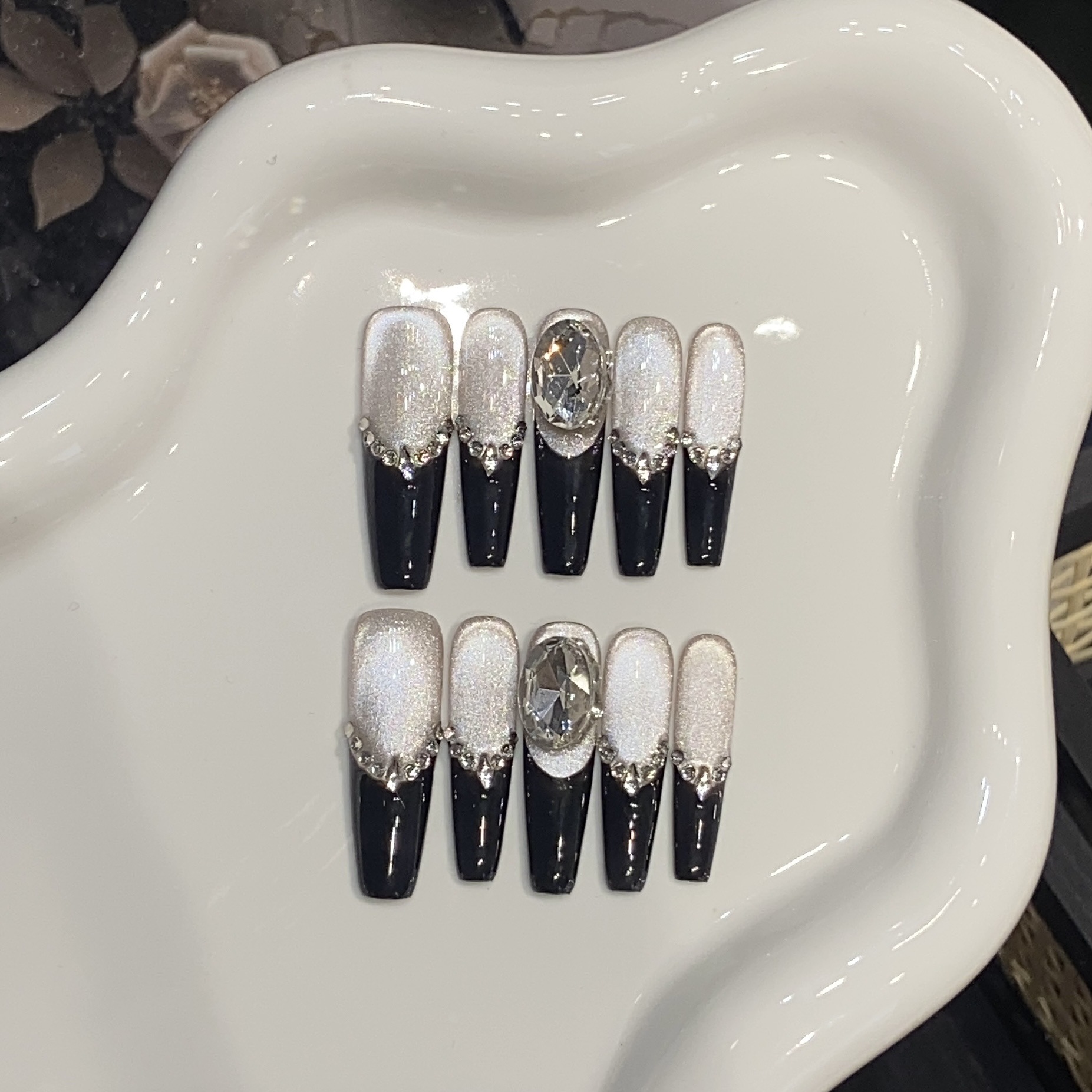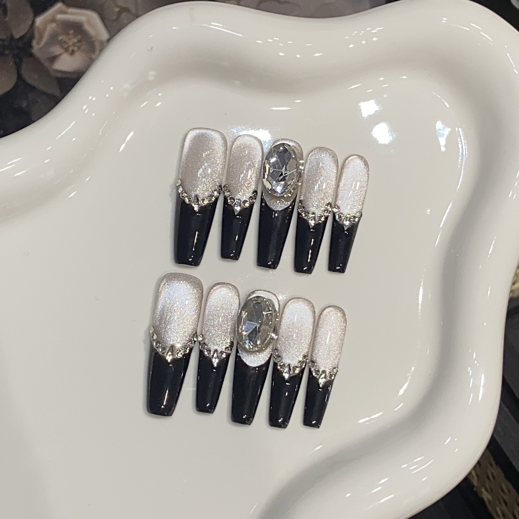 一只顾美甲 高级感银色灯泡猫眼黑色法式小碎钻黑金公主穿戴甲片