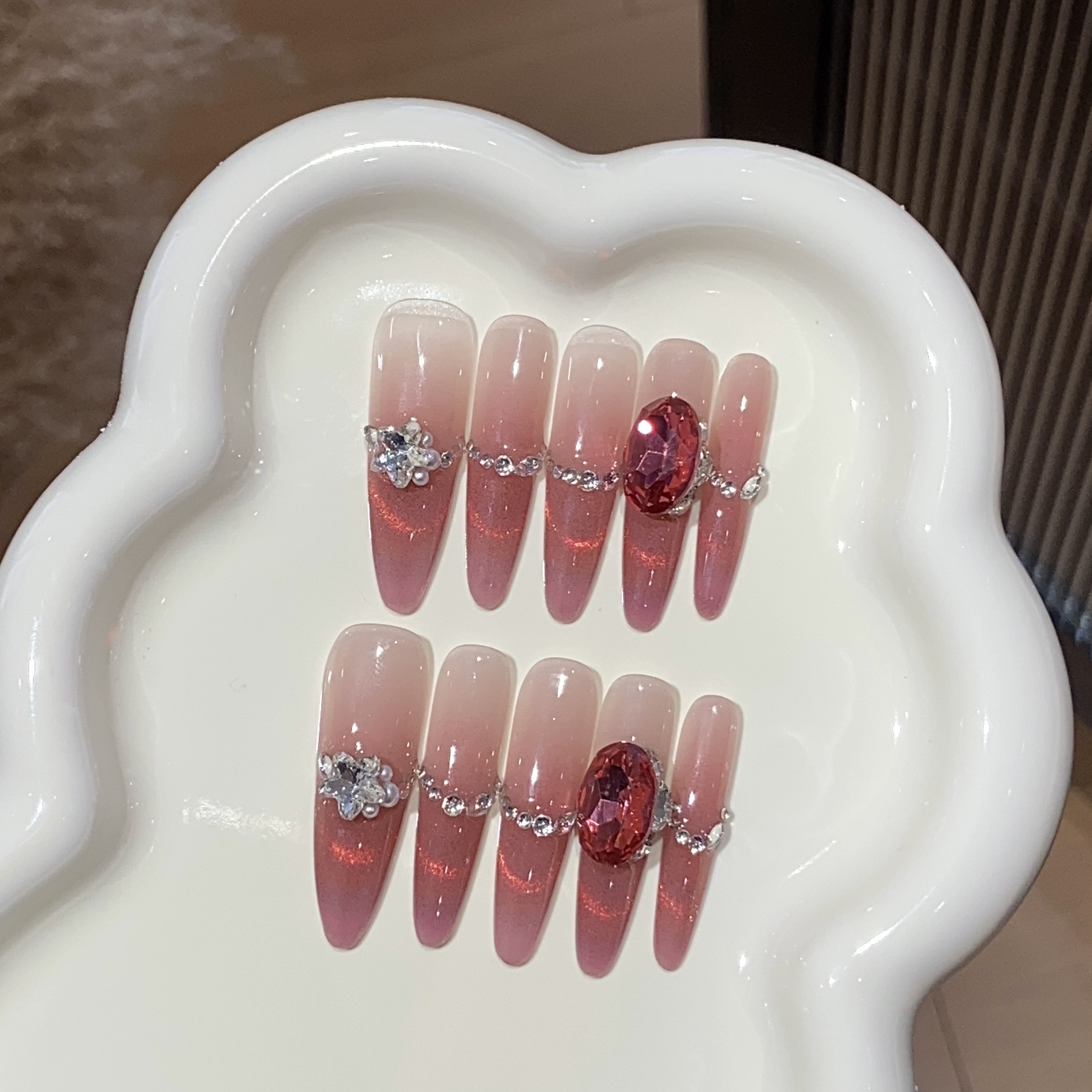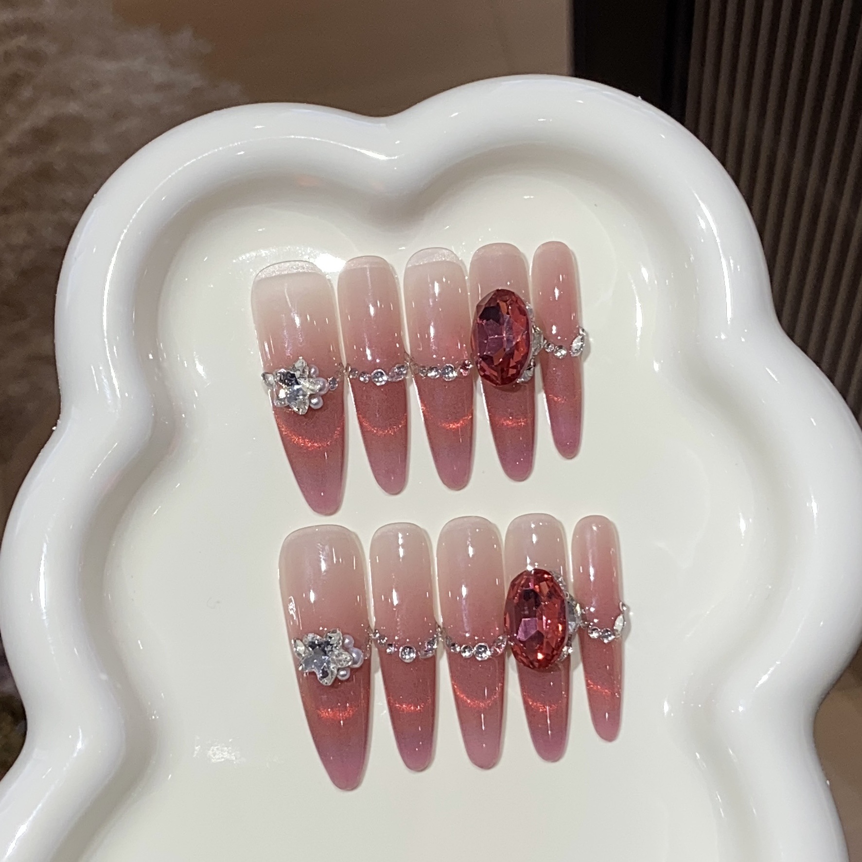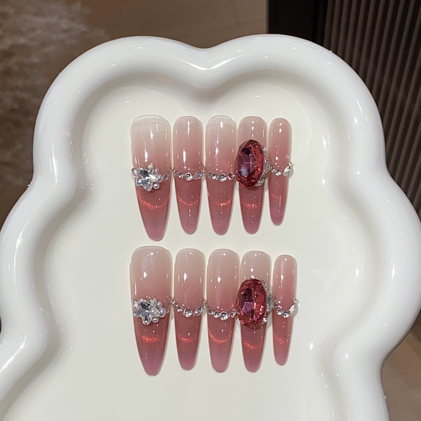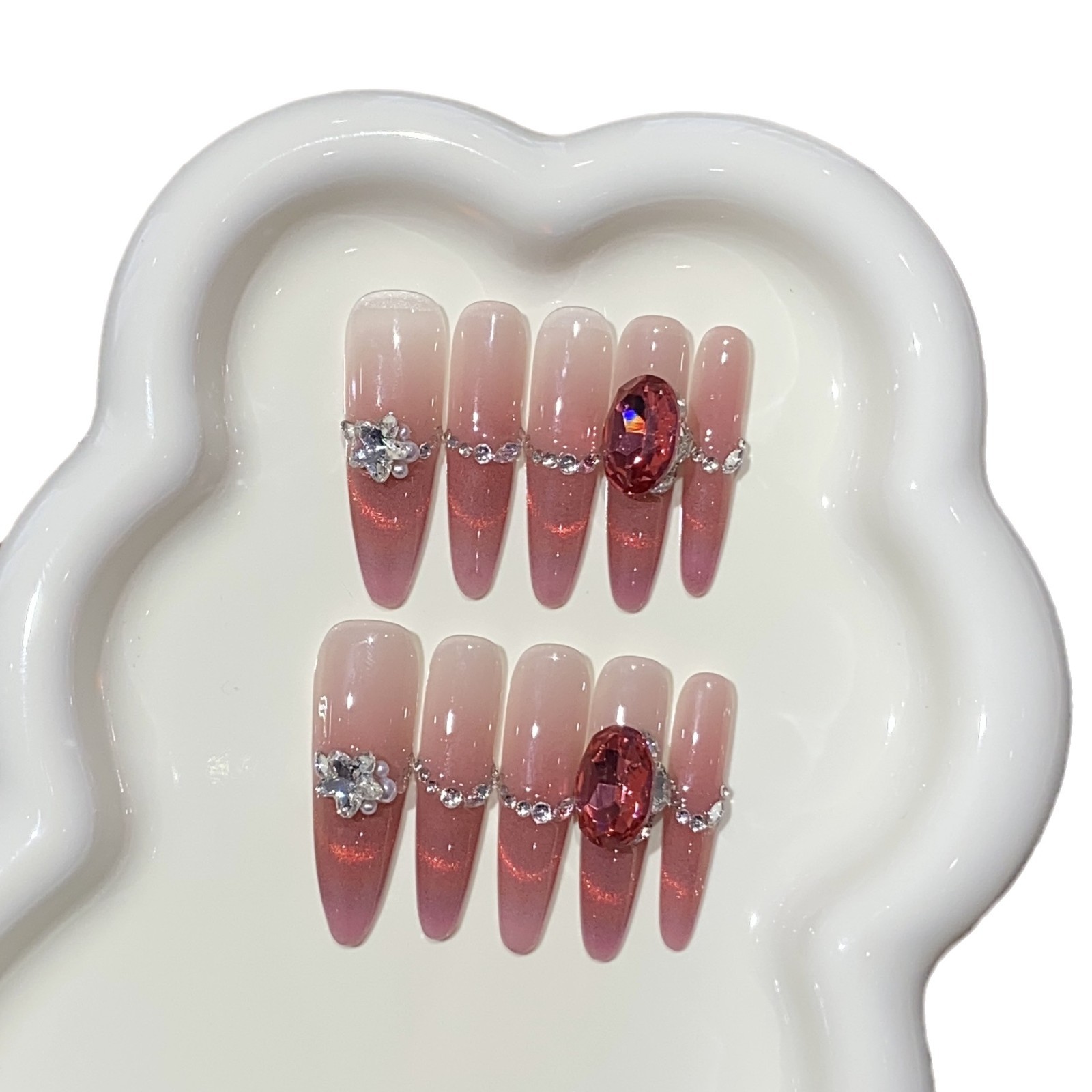 一只顾美甲 冰透粉色渐变极光微笑猫眼粉色椭圆钻草莓甜酒穿戴甲